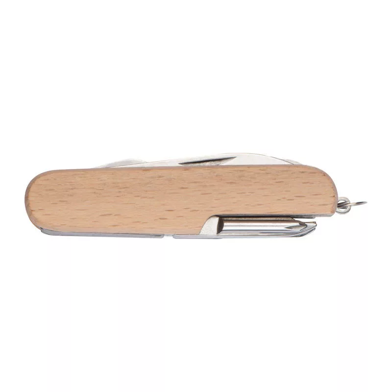 Fa bevonatú 11 részes zsebkés rozsdamentes acélból, 1 késsel, 2 fűrésszel, ollóval, palack- és konzervnyitóval, dugóhúzóval, körömreszelővel, 2 csavarhúzóval stb.