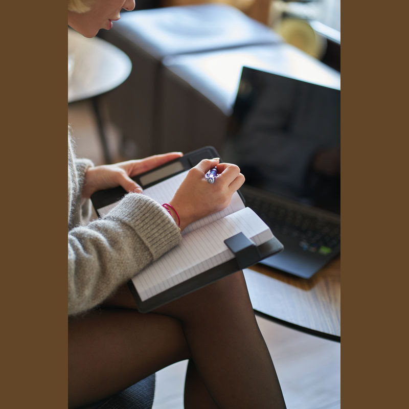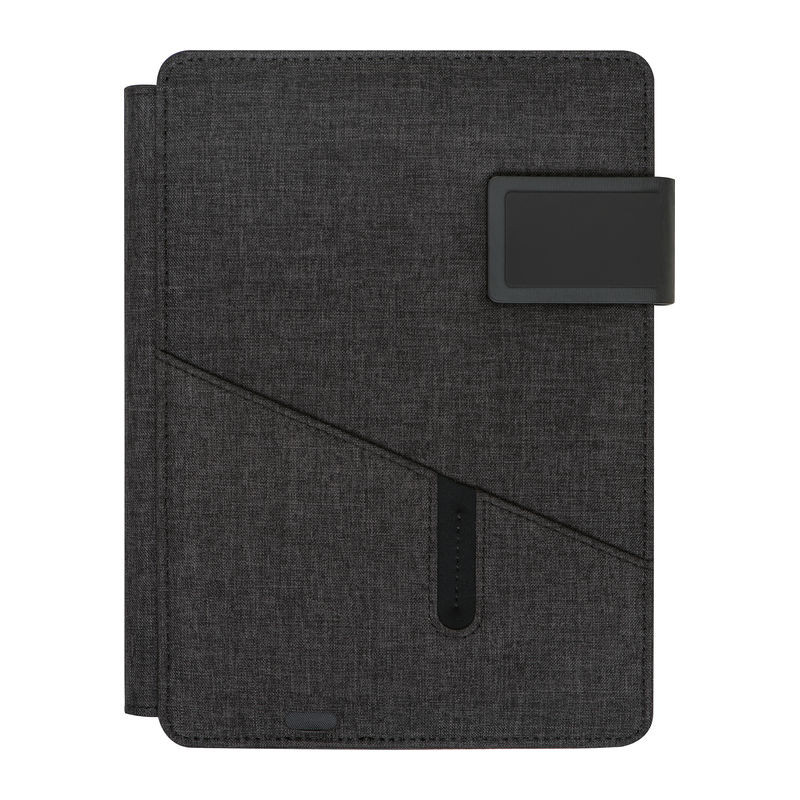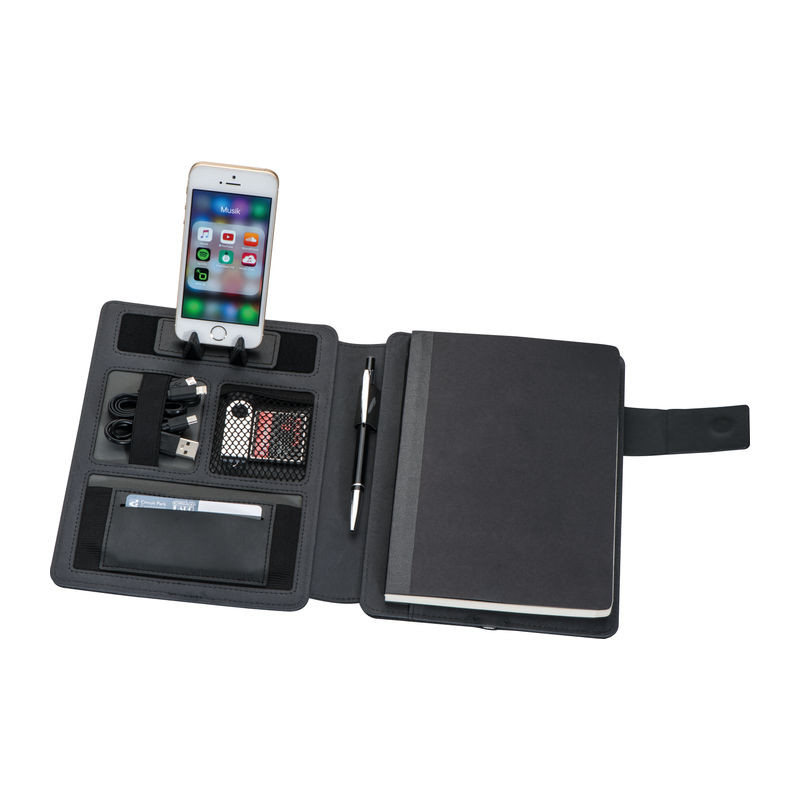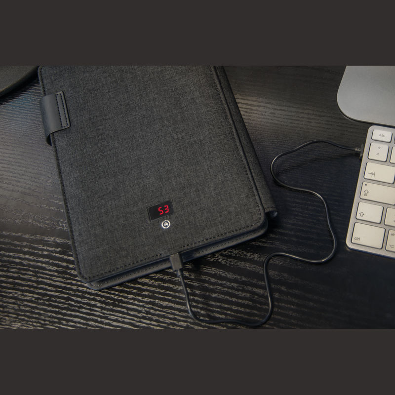 A5 méretű mappa és jegyzetfüzet beépített 4000 mAh kapacitású külső akkumulátorral, 128 oldalas notesz, és külső tároló zsebek.