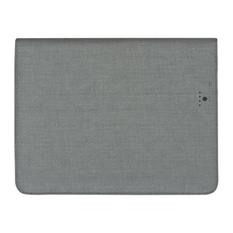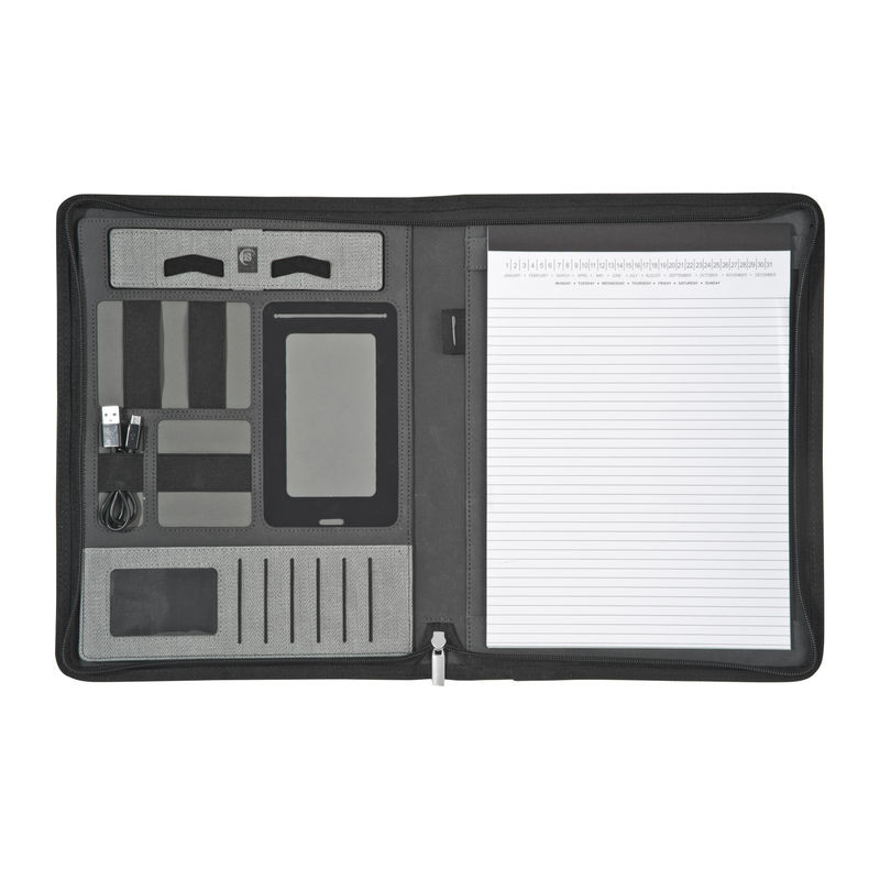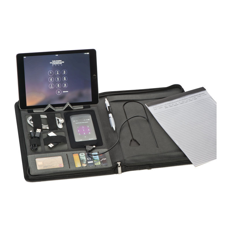 A4 dokumentumtartó mappa műbőrből, amely tartalmaz egy 5000 mAh kapacitású külső akkumulátort, USB-kábelt, 8 belső zsebet, mobiltelefon zsebet, golyóstoll pántot, tablet tartó pántot és egy jegyzettömböt.