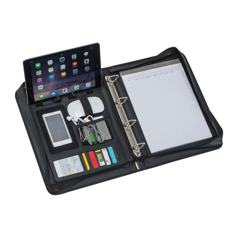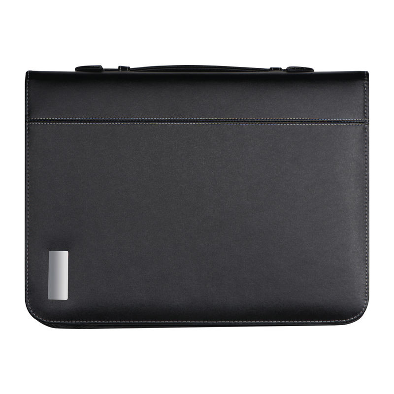 Kiváló minőségű bőrrostokból készült A4-es aktatáska mappa, cipzárral, zsebekkel, névjegykártyatartóval, tolltartó pánttal, okostelefon zsebbel és -tartóval, gyűrűs mechanizmussal, valamint nyomtatott naptár részes, vonalas jegyzettömbbel.