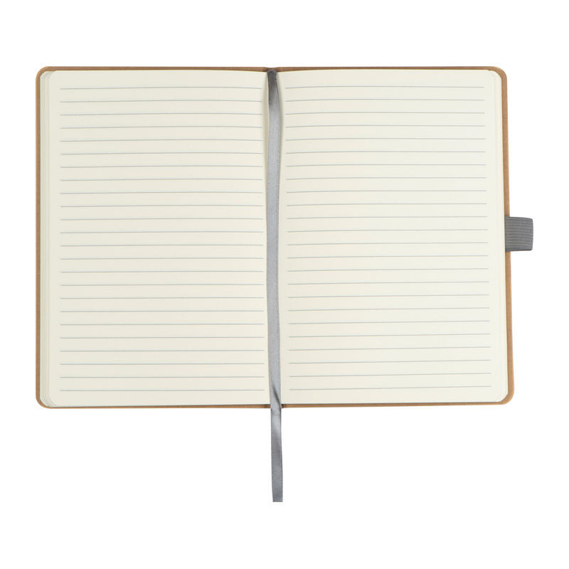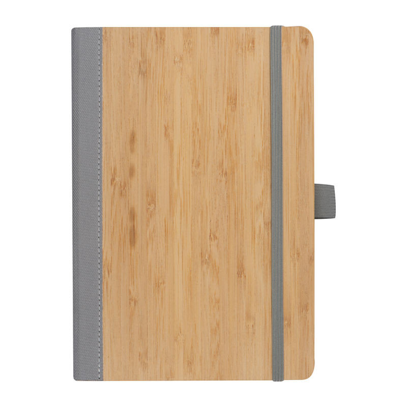 Elöl bambusz borítású jegyzettömb, hátul újrahasznosított műanyag borítással. A jegyzetfüzet 192 vonalas oldalt, könyvjelzőt és tolltartó hurkot is tartalmaz.