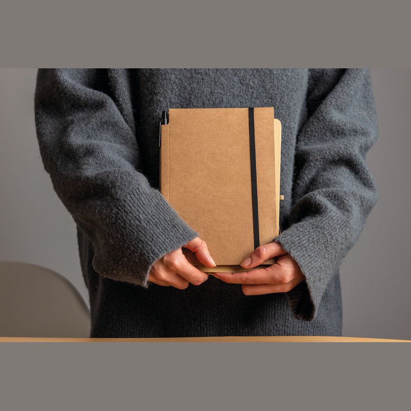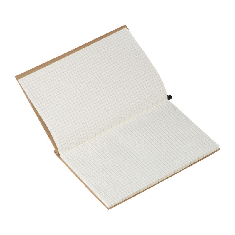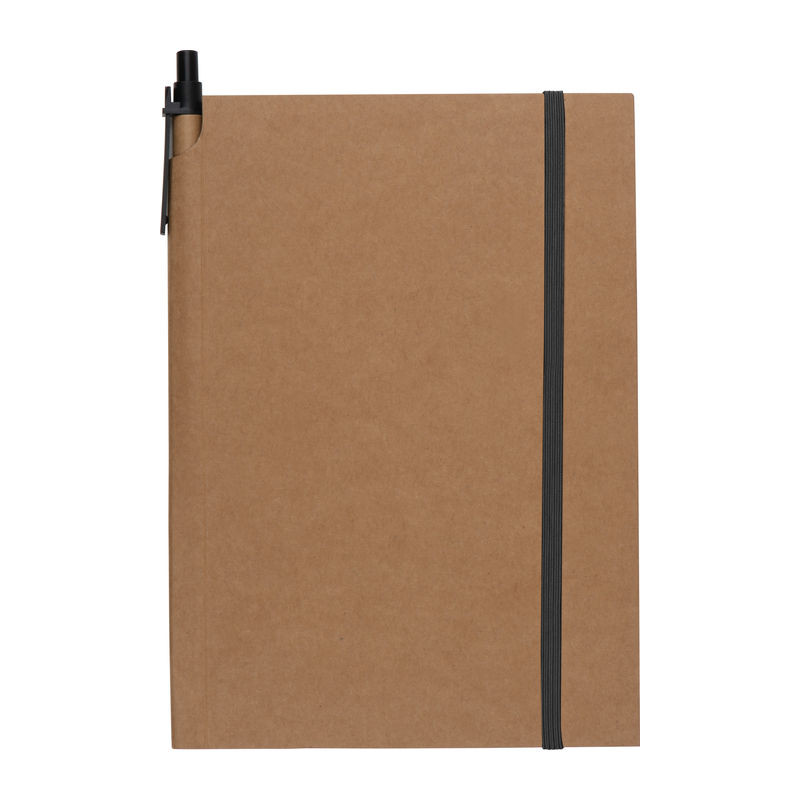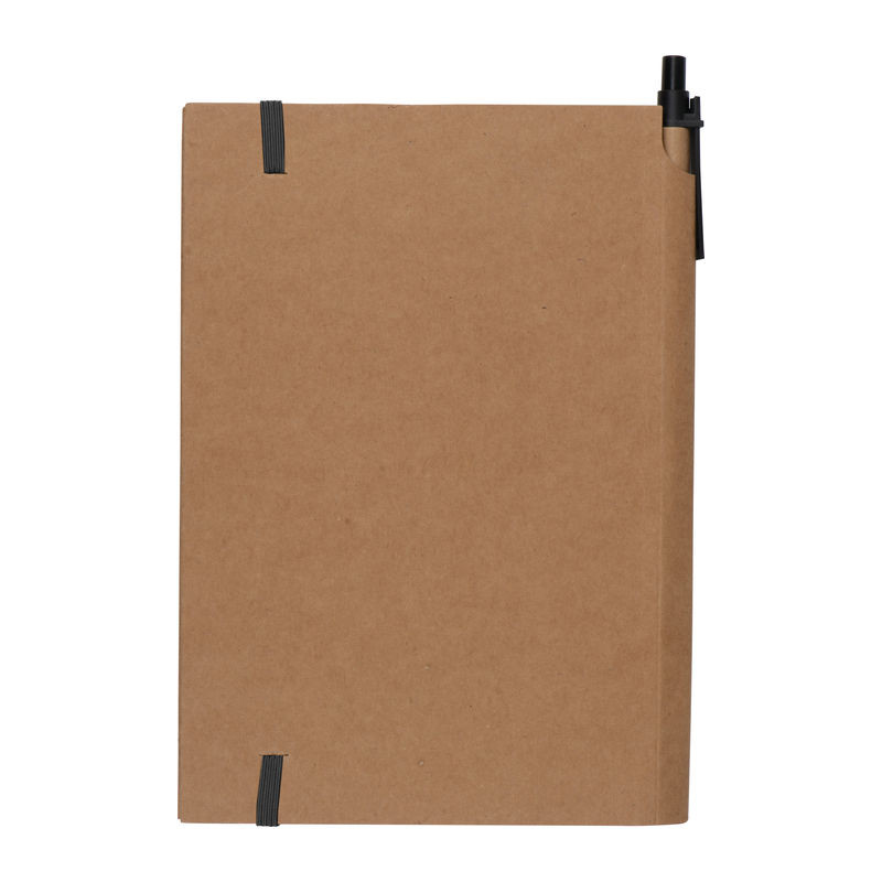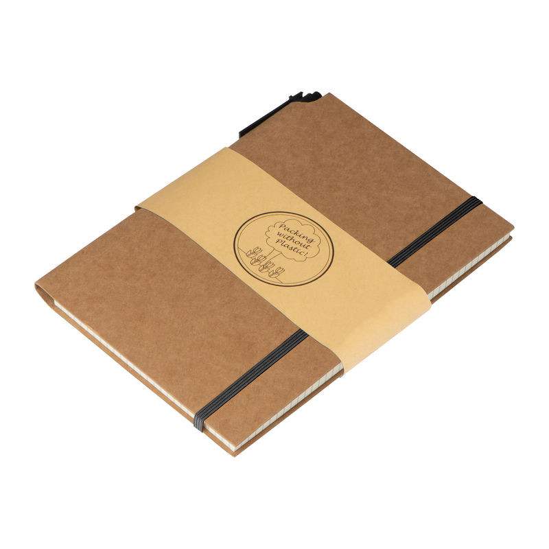 Jegyzetelő notesz környezetbarát karton fedőlappal, 160 kockás oldallal és gumipánttal. A jegyzetfüzetet golyóstollal együtt szállítjuk.