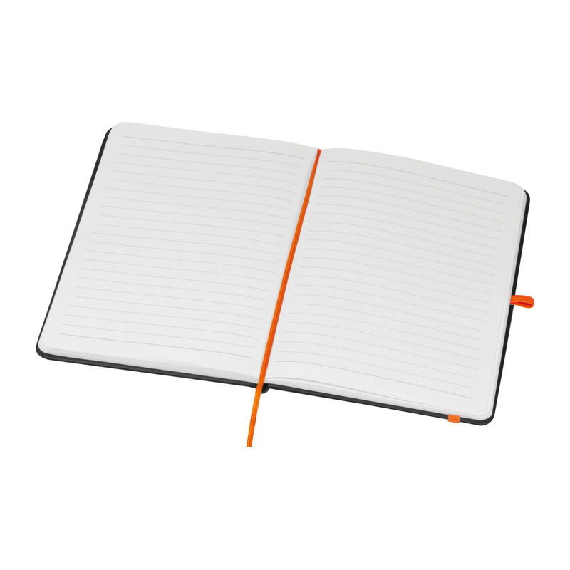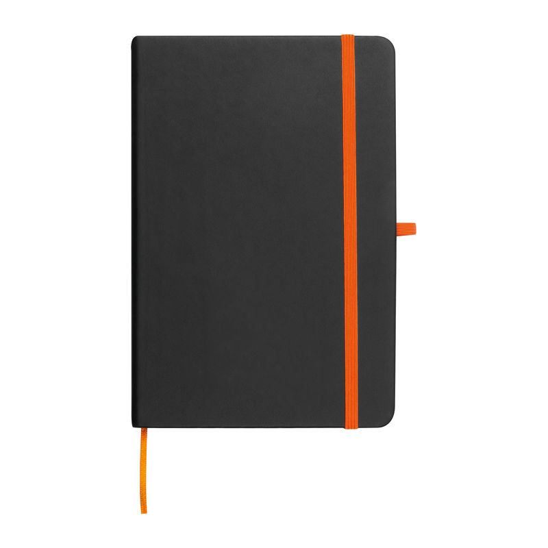 A5 méretű jegyzetfüzet PU borítóval, 192 vonalas oldallal, színes könyvjelzővel, tolltartó hurokkal és gumiszalaggal. A gravírozás színe megegyezik a gumiszalagéval.
