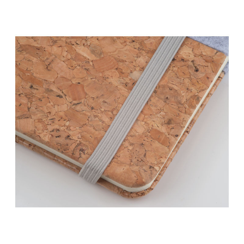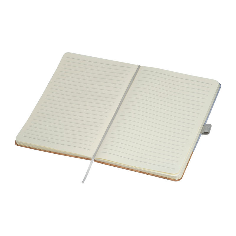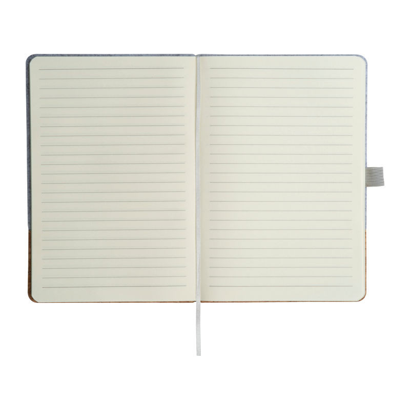 A5 méretű jegyzetfüzet újrahasznosított RPET filc és parafa borítással, 160 vonalas oldallal, gumis pánttal és tolltartó hurokkal.