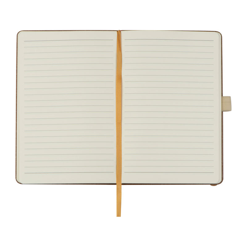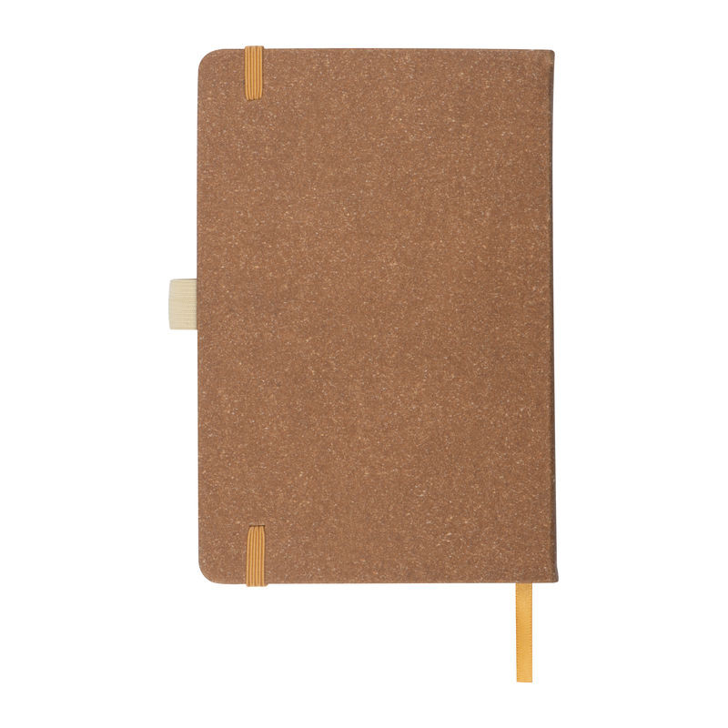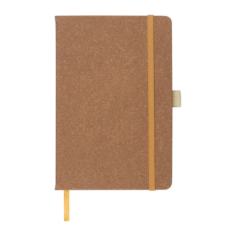 A5-ös notesz újrahasznosított bőrből készült borítóval, gumipánttal, könyvjelzővel, tolltartó hurokkal és 160 vonalas oldallal.