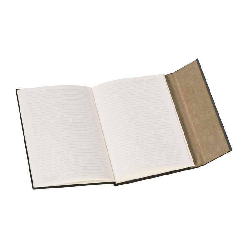 Gumírozott A5 méretű notesz, fém szegéllyel. 192 vonalas oldalt tartalmaz, mágnessel zárodó borítóval.
