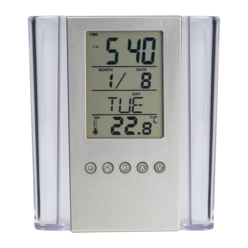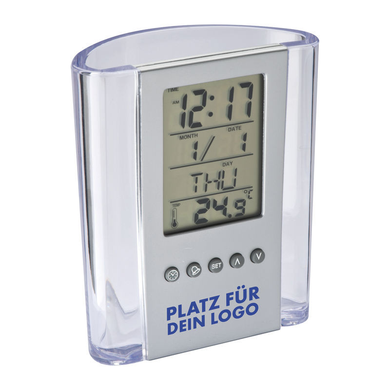 Akril asztali írószertartó, órával, ébresztővel, dátum és napok jelzővel, és hőmérővel. A gombok alatti felület logózható, az elemet tartalmazza.