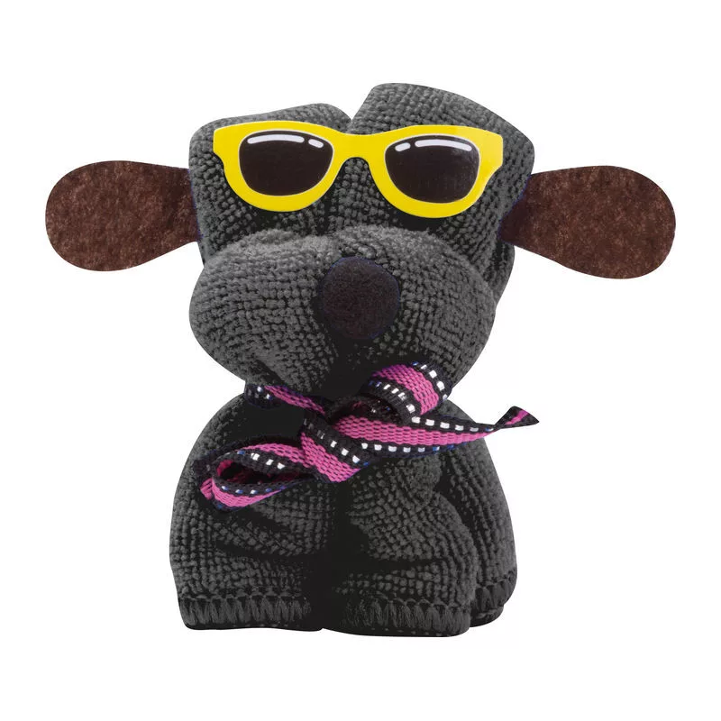 Puha mikroszálas kendő (20 x 20 cm), kutya formára hajtogatva és csomagolva.