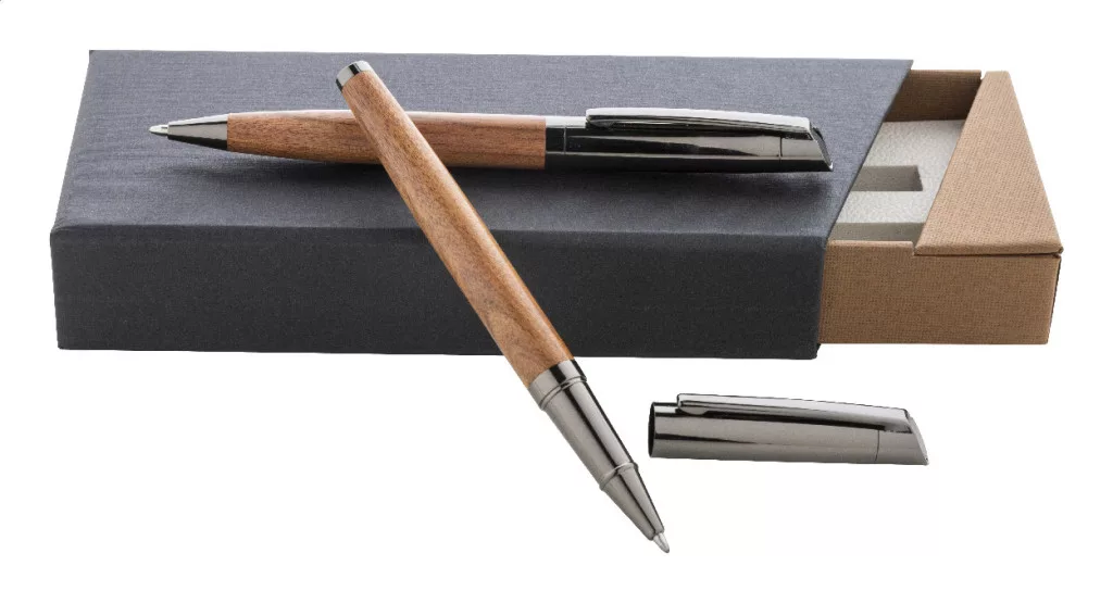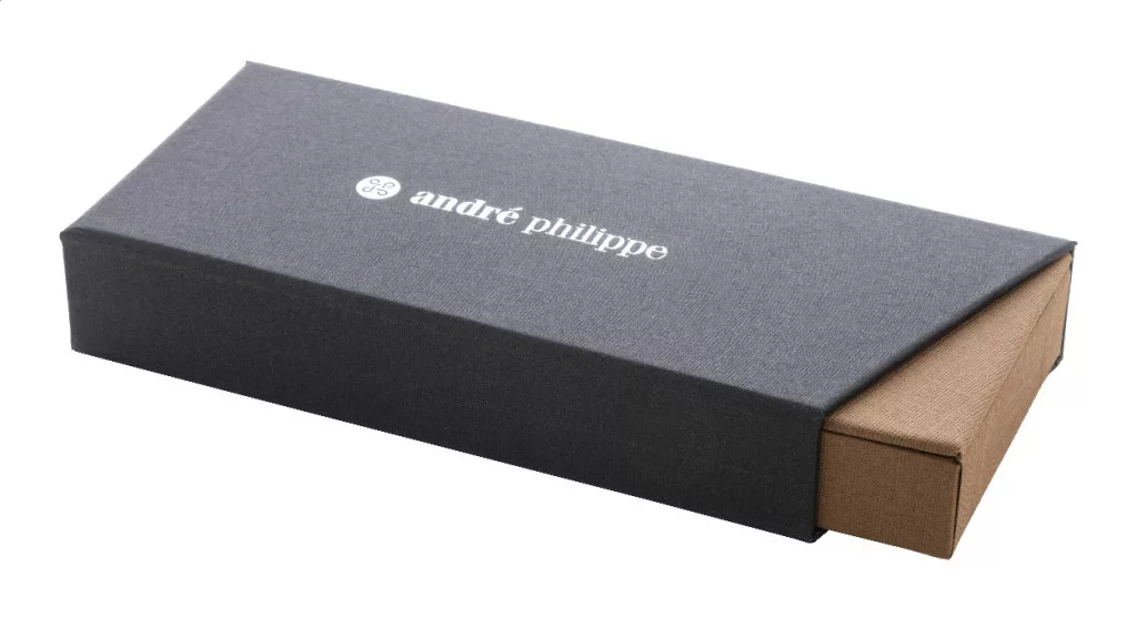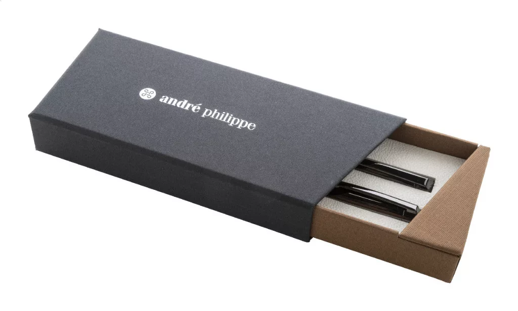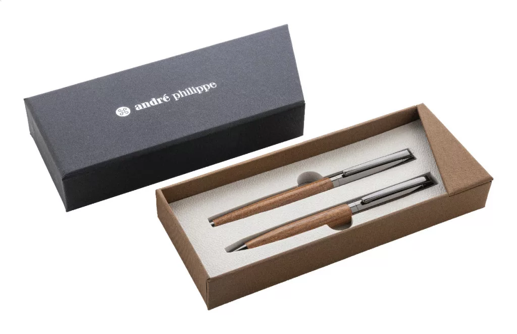 Elegáns, fém golyóstoll és rollertoll szett fa testtel és fényes fegyverfém részletekkel. Kéttónusú ajándékdobozban, kék tollbetéttel. André Philippe márkatermék.