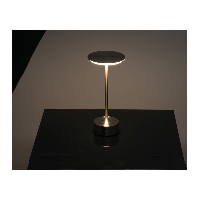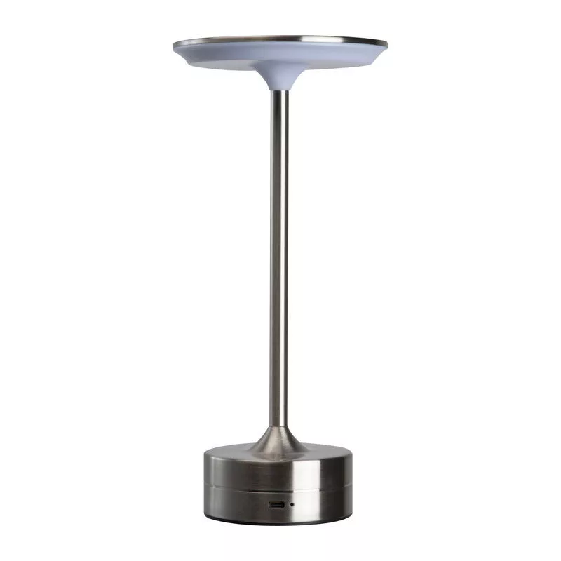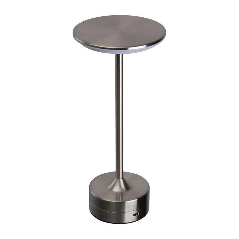 Rozsdamentes acél asztali lámpa újratölthető akkumulátorral (800 mAh). A fény színe szabályozható, meleg és hideg fény között. C-típusú töltőkábelt tartalmaz