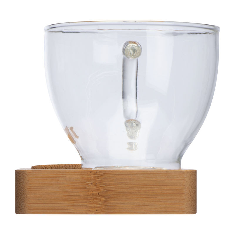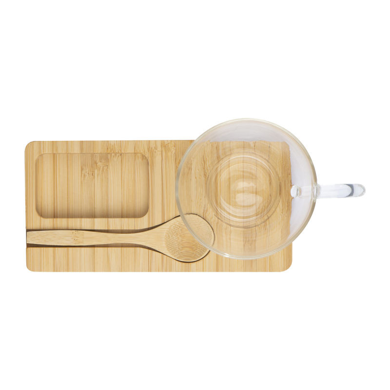 A szett tartalmaz egy kis bambuszból készült tálcát, bambusz kávés kanalat, egy üveg csészét 150 ml űrtartalommal és helyet a cukor vagy csoki számára.