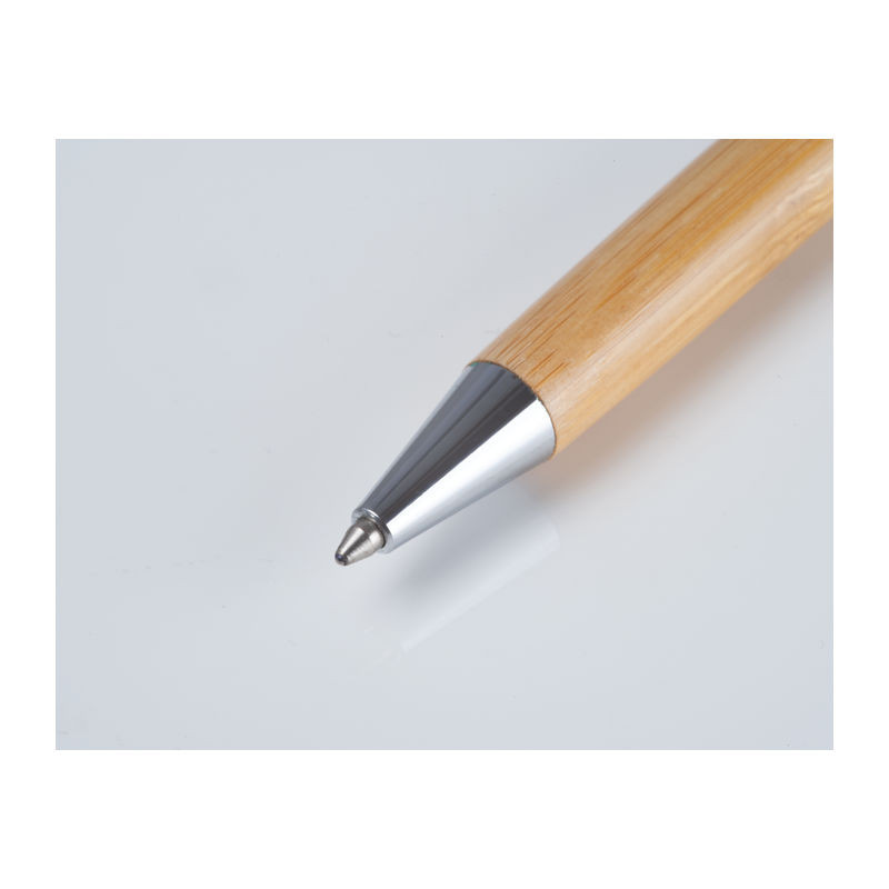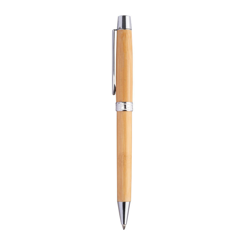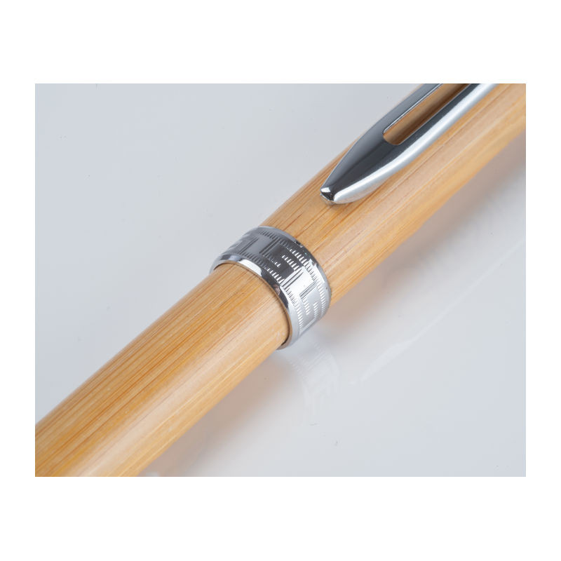 Bambusz, fém kiegészítőkkel ellátott csavaró mechanikás golyóstoll, kék színű cross tollbetéttel. Hozzáillő bambusz tokban szállítva.
