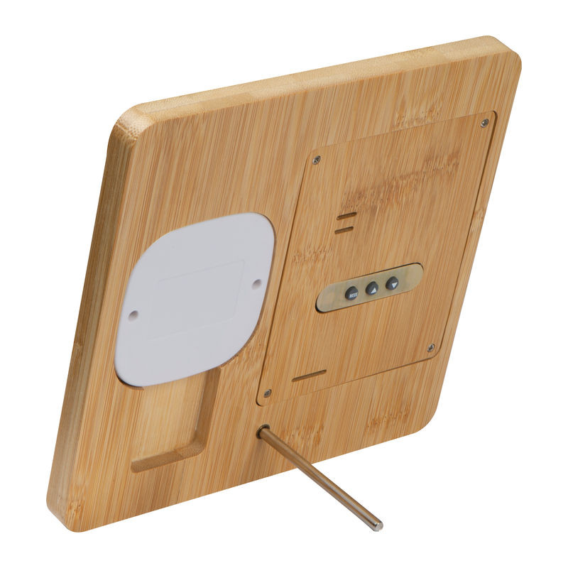 Bambusz időjárás állomás és vezeték nélküli töltő, digitális kijelzővel, amely mutatja a hőmérsékletet, a páratartalmat és az időt. Mobiltelefon tartóként használható.