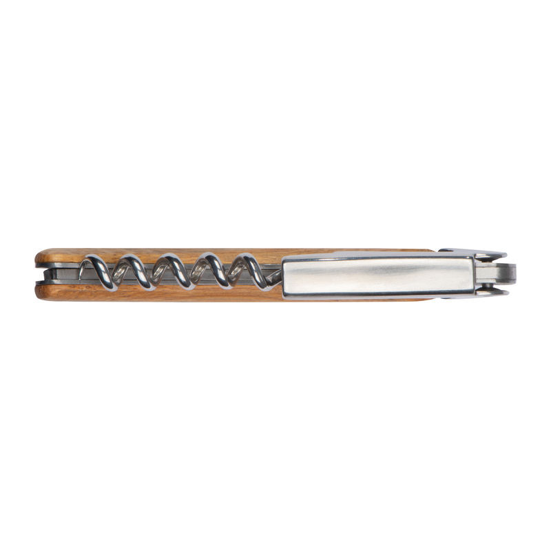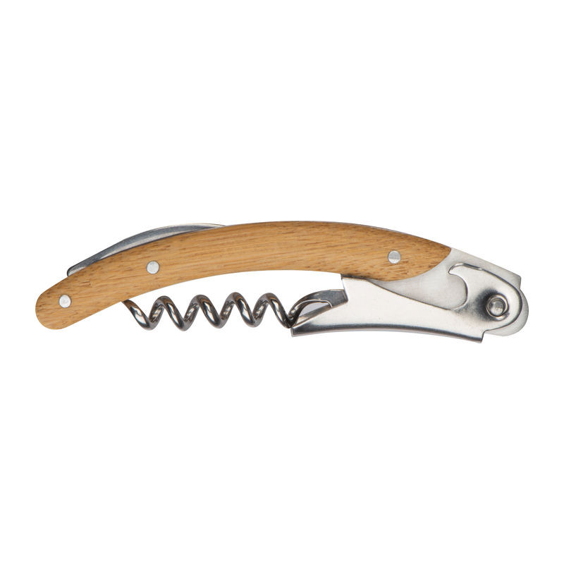 Fémből készült bambusz markolatú pincérkés sörnyitóval, fóliavágóval és dugóhúzóval.
