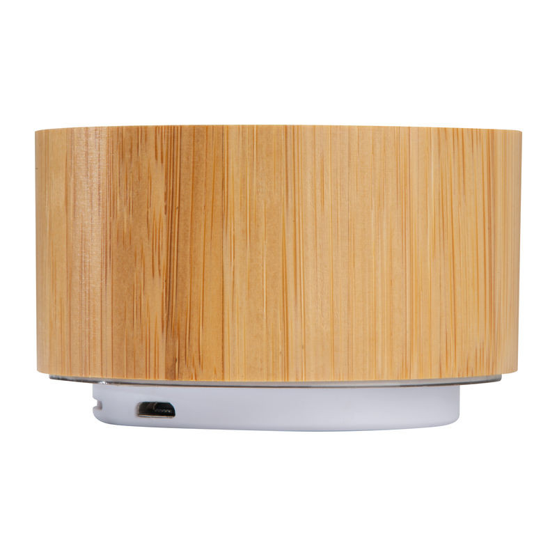 Elegáns kerek bluetooth hangszóró bambuszból, 300mAh akkumulátorral, 2h lejátszási idő, 10m hatótávval, LED világítással és micro USB töltőkábellel. Modern és trendi ajándék egyben! Termékenként szín- és mintázatkülönbségek előfordulhatnak.