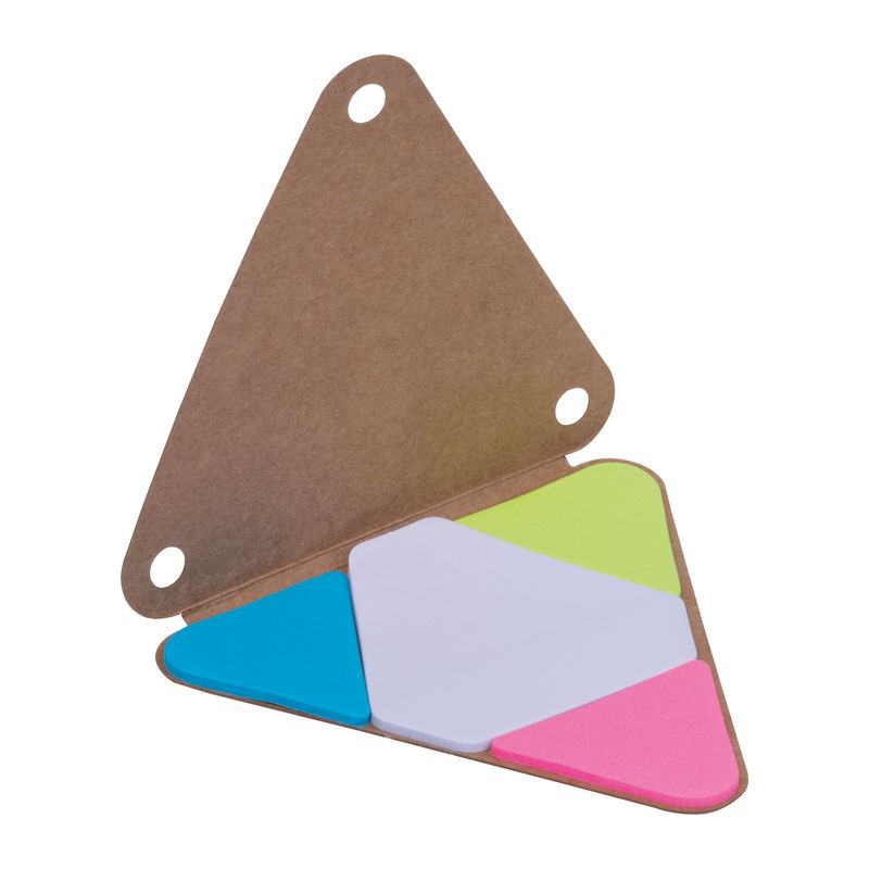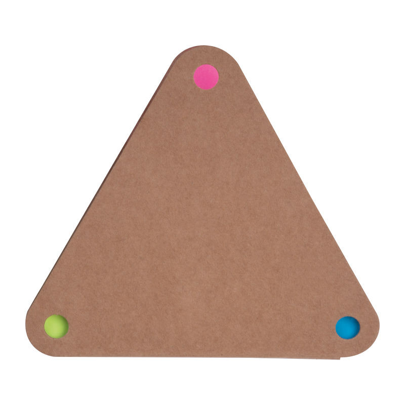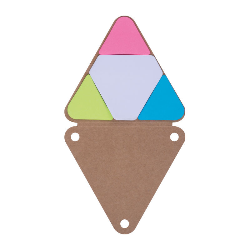 Háromszög alakú jegyzettömb öntapadós lapokkal. A jegyzettömb 20 darab nagyobb fehér öntapadós lapot és 3 x 20 darab kisebb, színes öntapadós lapot tartalmaz.
