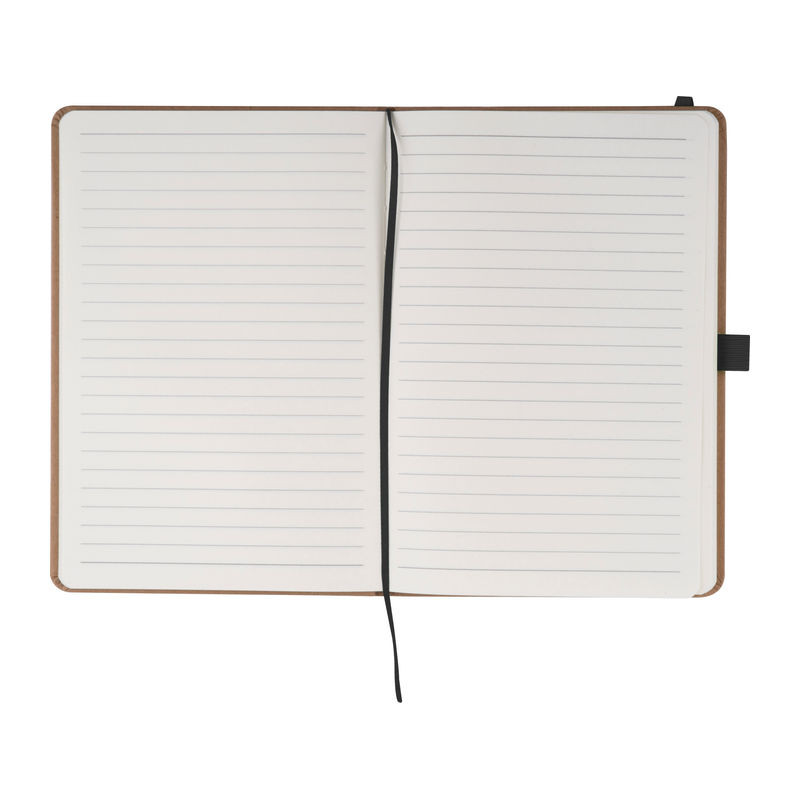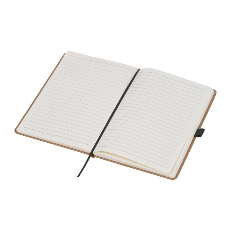 A5 méretű jegyzetfüzet újrahasznosított papírból, 160 vonalas oldallal, könyvjelzővel és golyóstolltartóval, amely színben harmonizál a gumis pánttal.