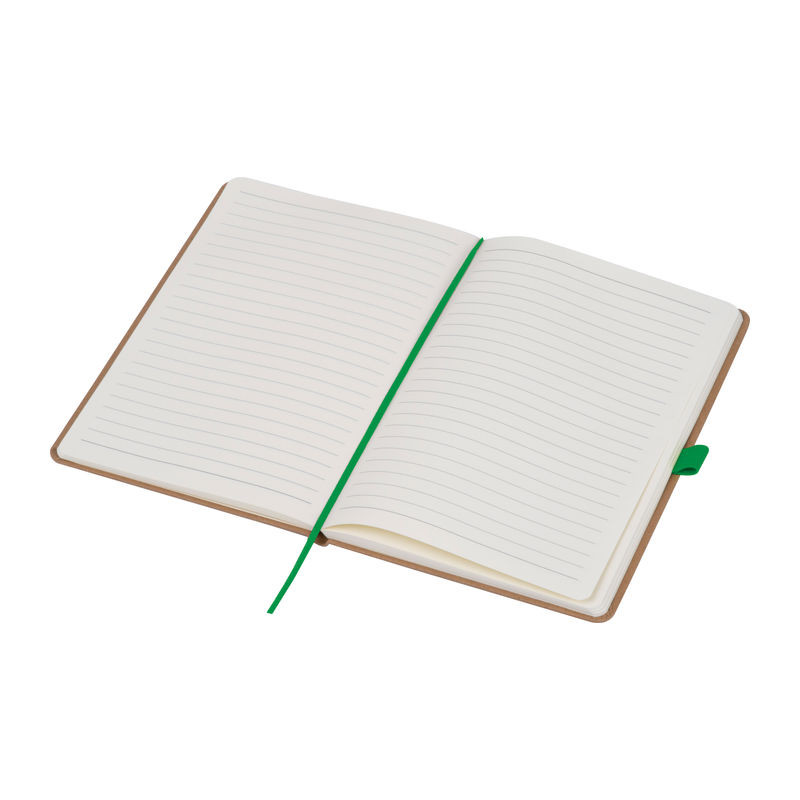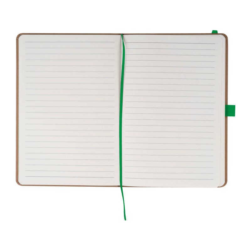 A5 méretű jegyzetfüzet újrahasznosított papírból, 160 vonalas oldallal, könyvjelzővel és golyóstolltartóval, amely színben harmonizál a gumis pánttal.