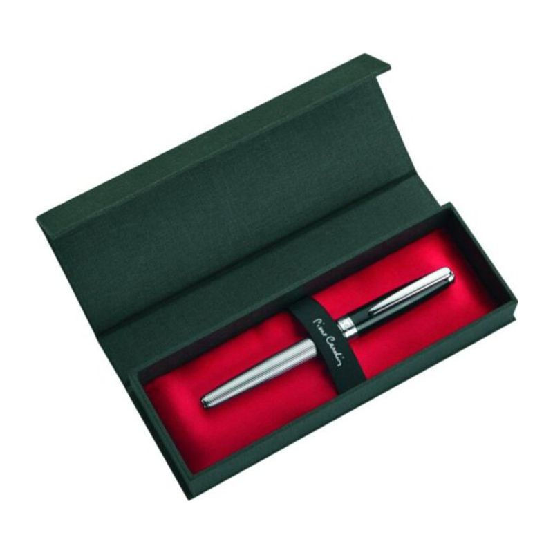 Pierre Cardin fém golyóstoll vaskos kivitelben. A fehér és fekete gravír kombinációja egyedi díszítést ad a tollnak. A golyóstoll kék színű minőségi tollbetétlel (0,5mm) van szerelve.A díszdoboz fekete pótbetétet, hitelességi bizonyítványt tartalmaz.