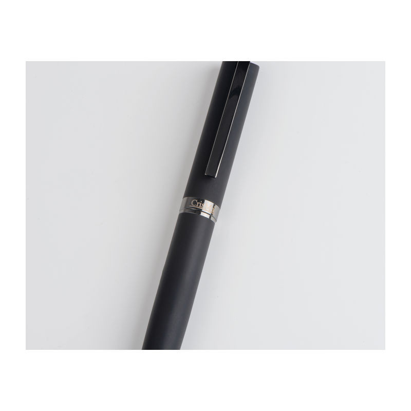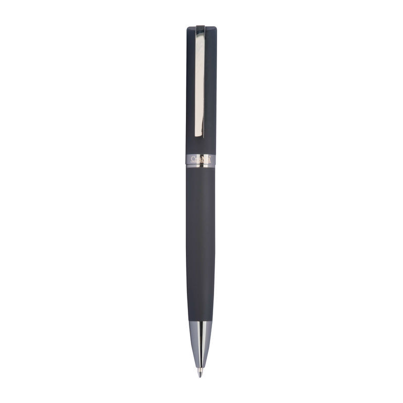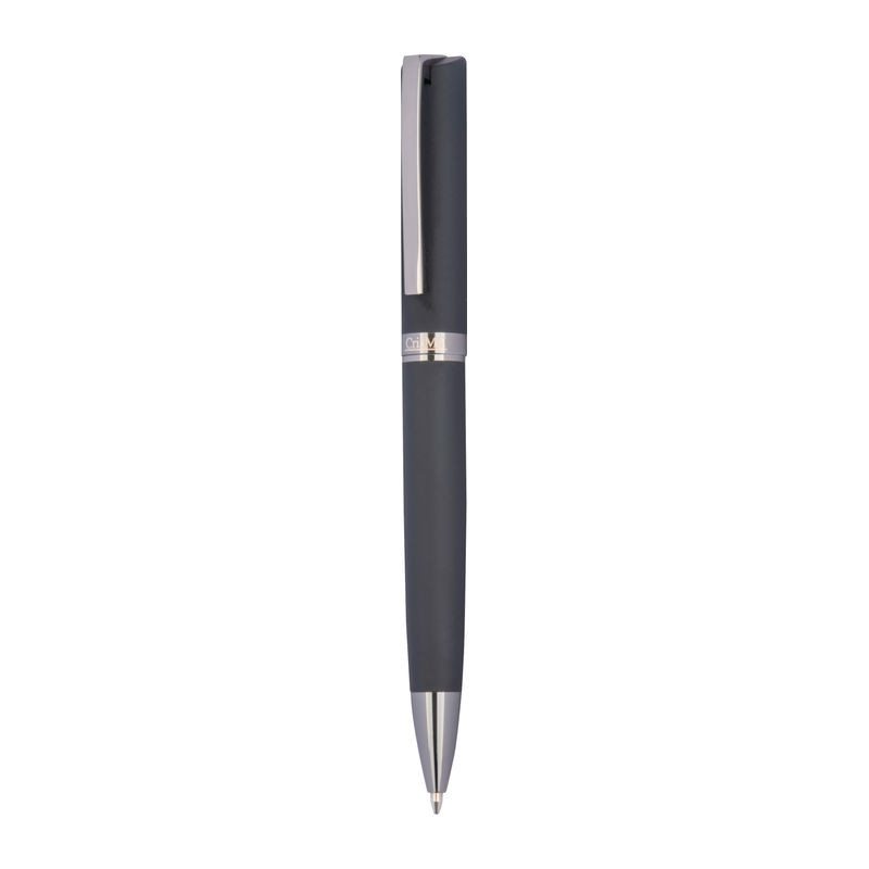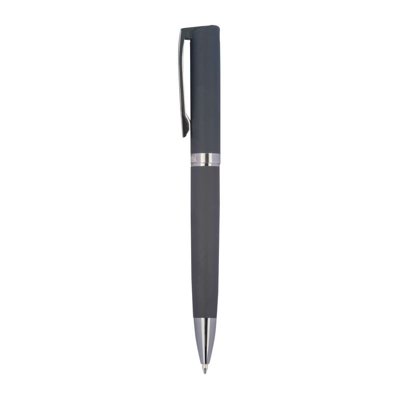 Fém csavaró mechanikás golyóstoll gumírozott felülettel, klasszikus dizájnnal és kék színű, jumbo tollbetéttel. Fekete tokban szállítva.