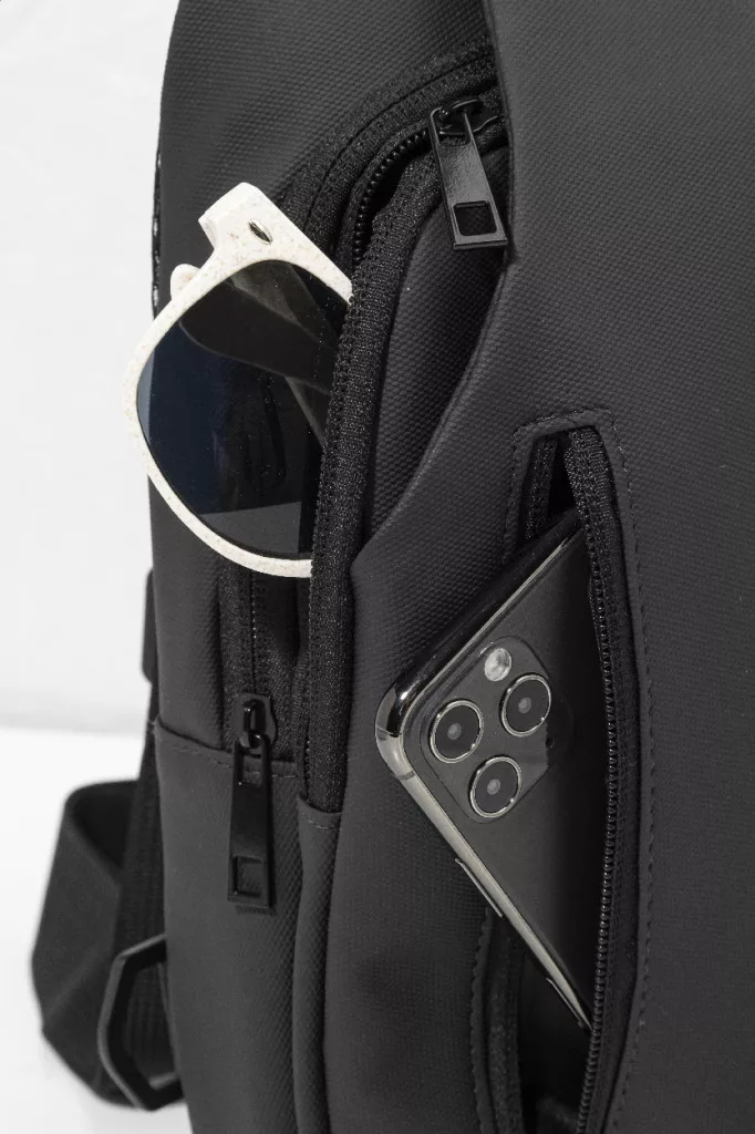 Vízálló RPET oldaltáska cipzáras zsebekkel, csatos zárral és párnázott hátrésszel. Állítható vállpánttal, bal és jobb oldali pozícióba állítható. PU bőr bevonatú 600D RPET poliészter, megkülönböztető RPET címkével.