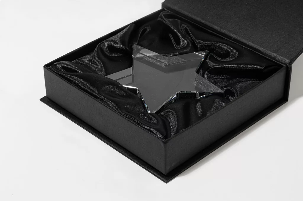 Csillag alakú üveg trófea, fekete díszdobozban.