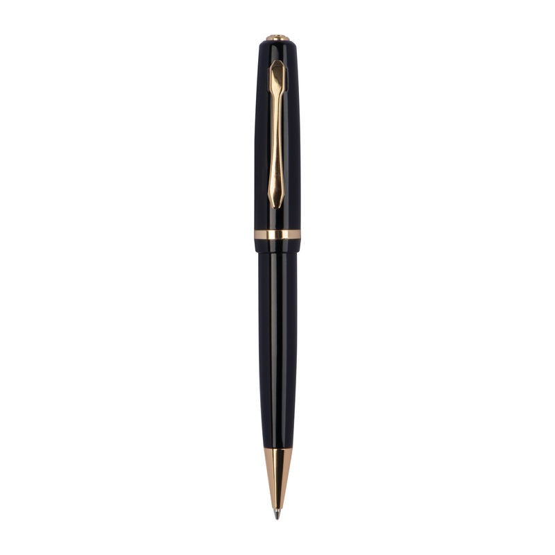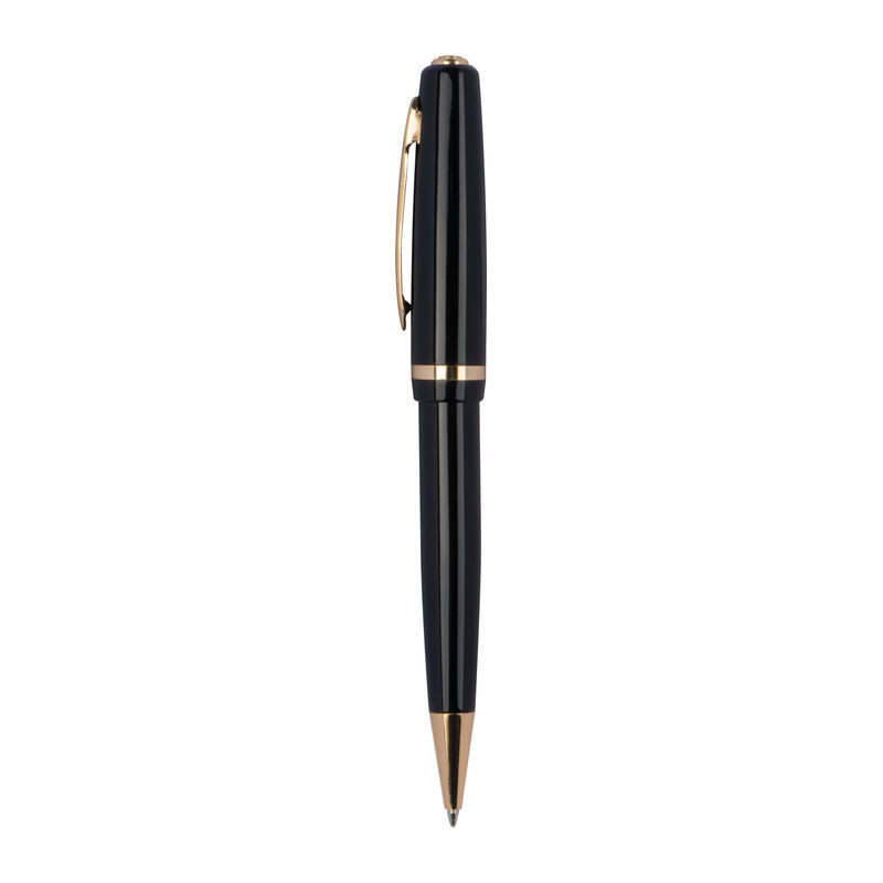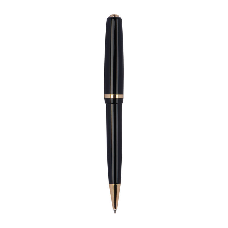 Csavaró mechanikás fém golyóstoll arany díszítéssel és kék tollbetéttel.