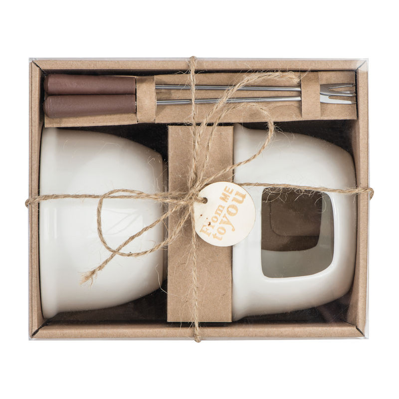 Kerámia csokoládé fondü készlet 2 fondü villával. Helyezzen gyümölcsöt vagy kekszet a csokoládéba, és élvezze ezt a gyönyörű ajándékcsomagot.
