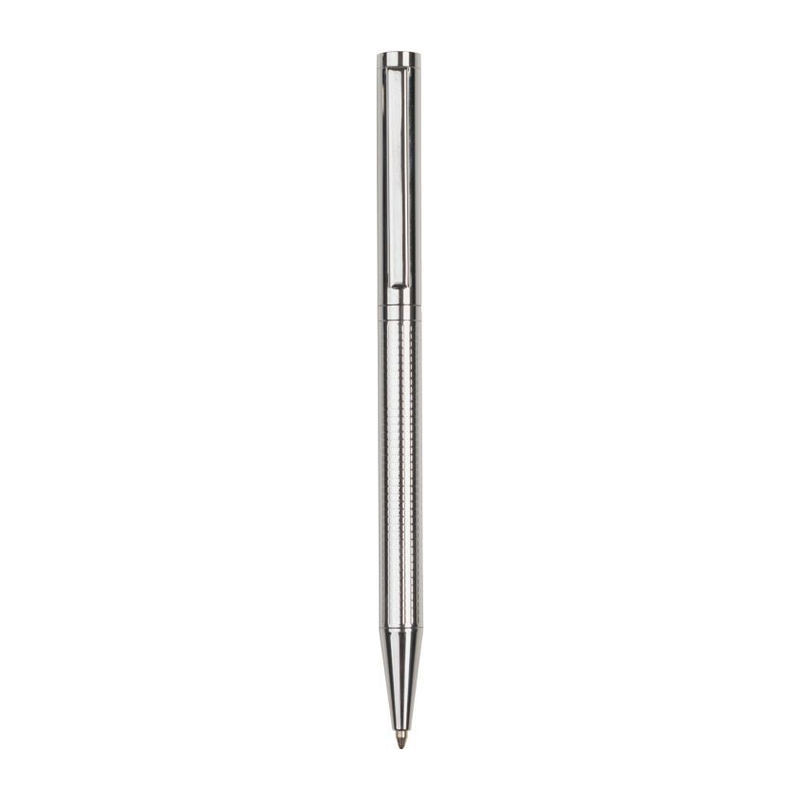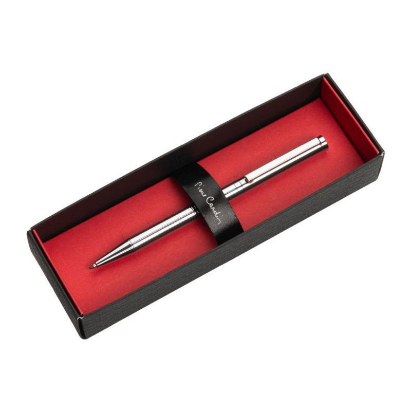 Elegáns és sima Pierre Cardin fém golyóstoll forgómechanizmussal. A toll teste sakktábla mintás gravírozással díszített. Kiváló minőségű kék betétet tartalmaz 1 mm-es heggyel, valamint tartalék fekete betétet is. Díszdobozban, eredetiségi tanúsítvánnyal együtt.