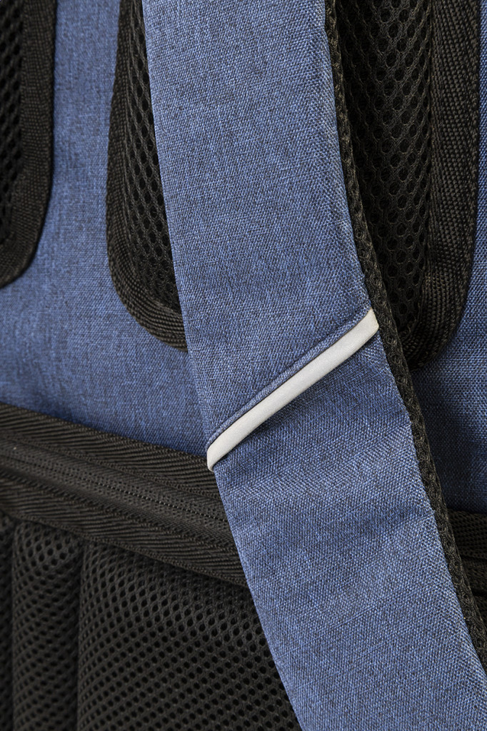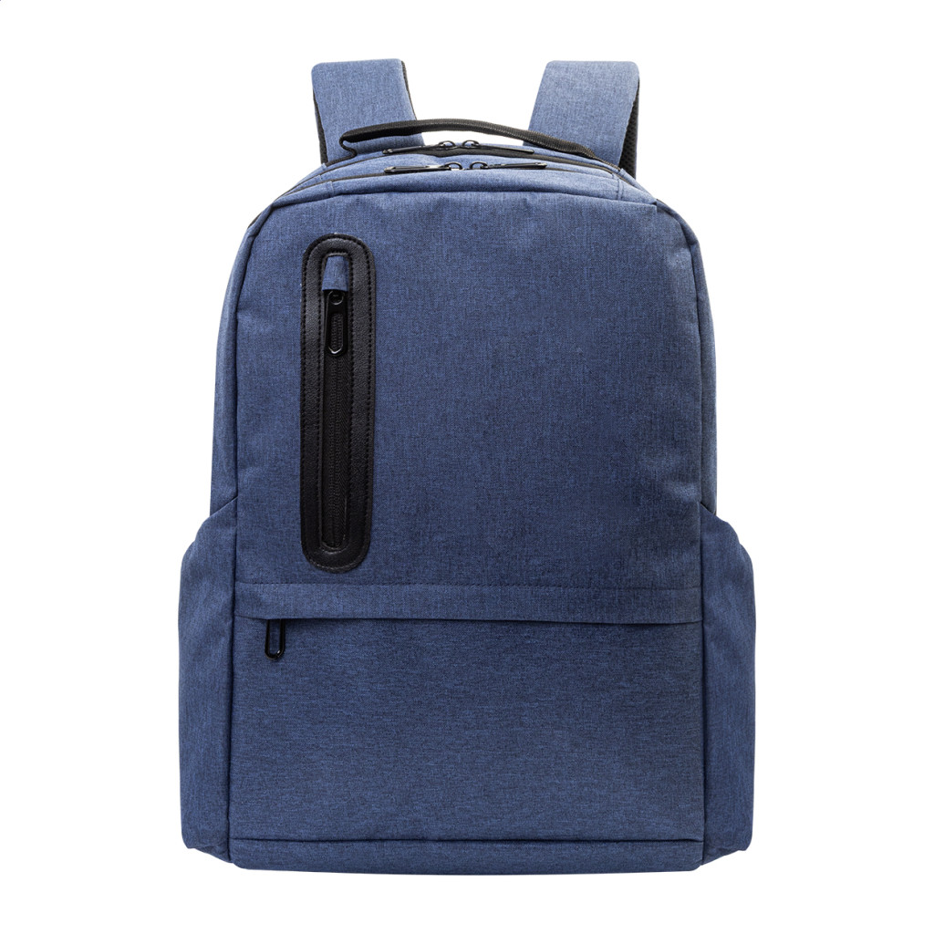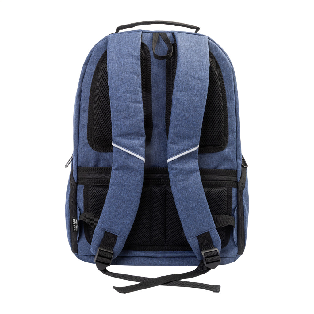RPET hátizsák cipzáras rekeszekkel, 2 cipzáras elülső zsebbel, cipzáras oldalsó zsebekkel és párnázott laptop rekesszel (15"-os). Párnázott hát- és vállpántokkal, lopásgátló zsebbel és bőrönd pánttal. 300D RPET poliészterből, megkülönböztető RPET címkével.