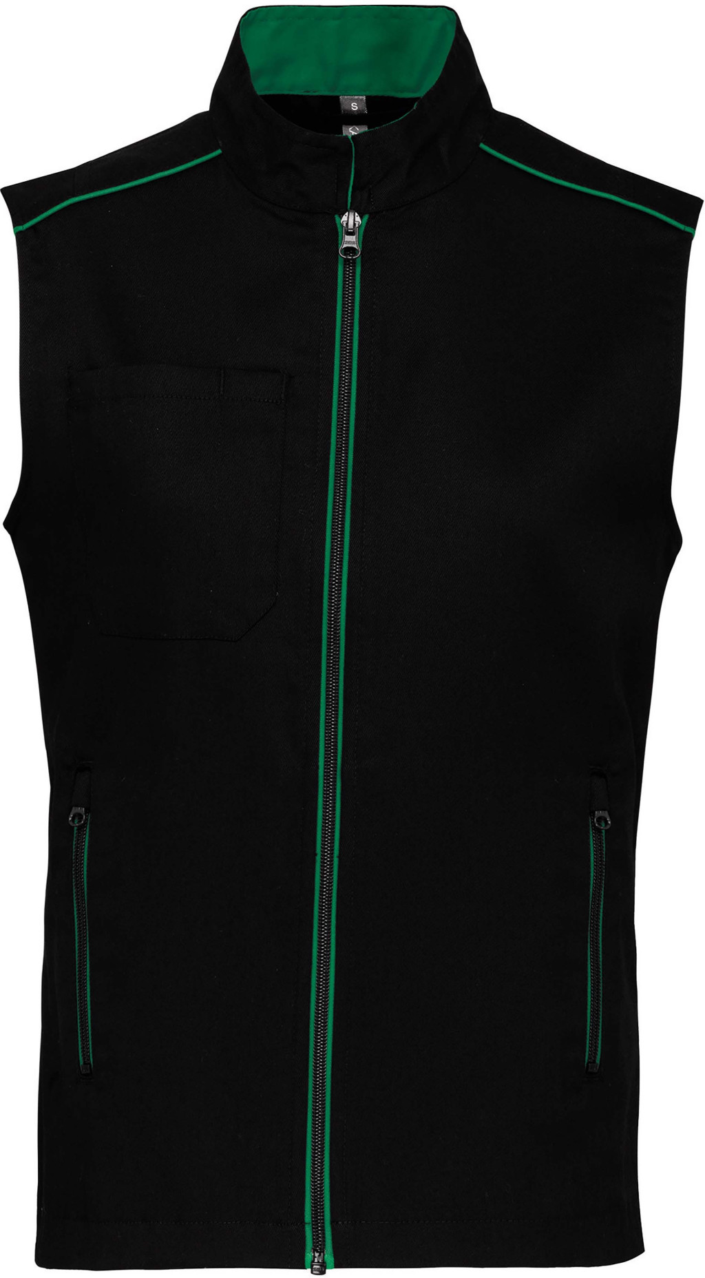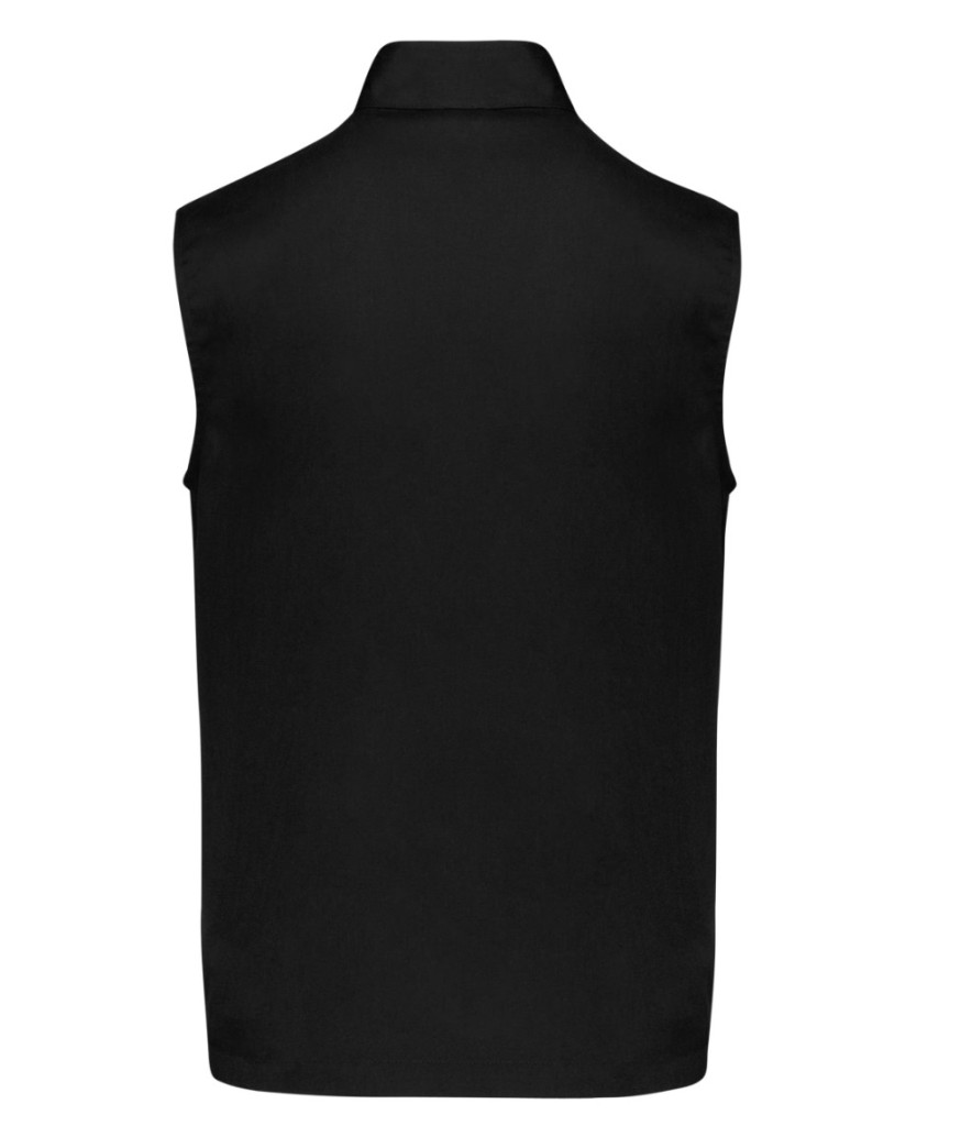 Férfi mellény, divatos csíkkal a váll részen. 60 fokon mosható, erős anyag. A jobb oldalon 1 nyitott mellzseb tolltartóval, belül 1 névcímkével, amely alapján könnyen azonosítható a tulajdonosa, így céges munkaruházatnak kiváló.