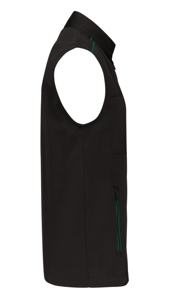 Férfi mellény, divatos csíkkal a váll részen. 60 fokon mosható, erős anyag. A jobb oldalon 1 nyitott mellzseb tolltartóval, belül 1 névcímkével, amely alapján könnyen azonosítható a tulajdonosa, így céges munkaruházatnak kiváló.