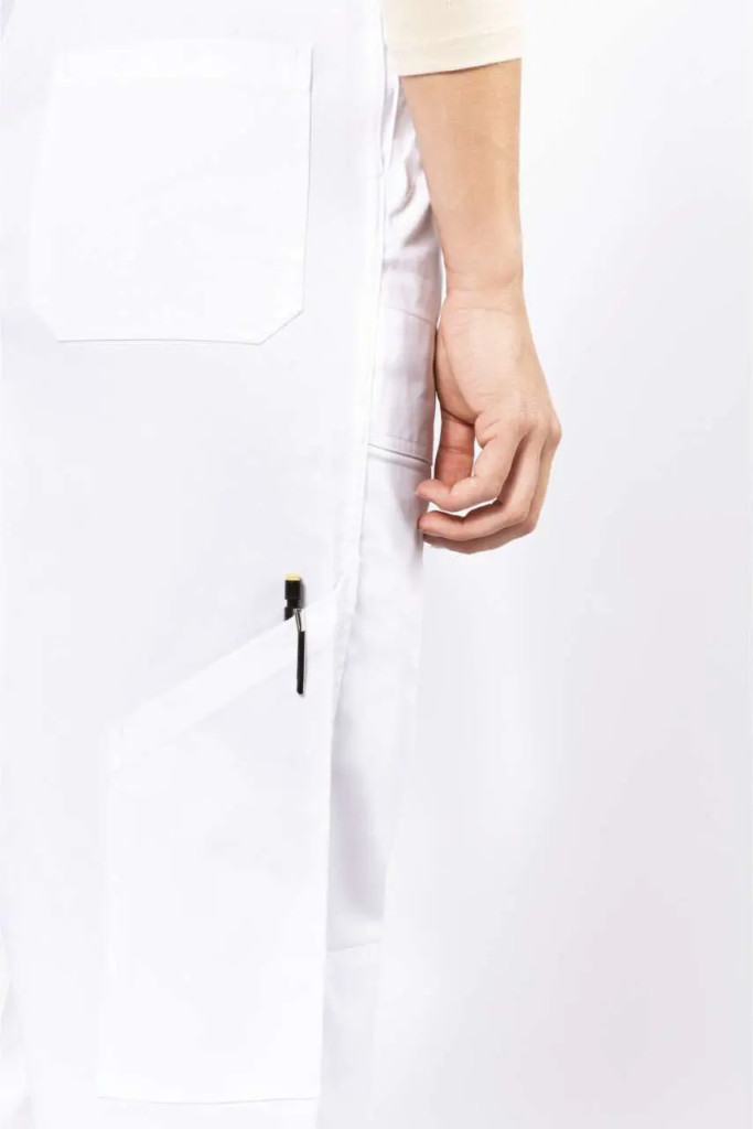 60 fokon mosható, twill szövet, 65% pamutot és 35% polyestert tartalmazó munkaruházati kantáros nadrág. 6 zsebes kivitel: 2 elülső rávarrt zseb + 1 nagy cipzáras elülső zseb 1 tolltartó zsebbel +2 hátsó rávarrt zseb. A pántok műanyag csattal állíthatóak. Hátul nagy rugalmas pánt a szabadabb mozgásért. Cipzáras záródás, oldalt 2 gombos gombolópánttal.