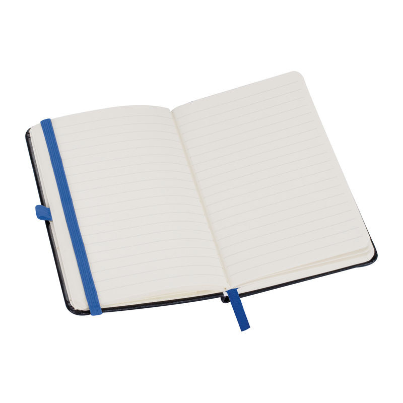 A6 méretű divatos notesz puha műbőr borítással, 160 oldallal, könyvjelzővel, tolltartó hurokkal, valamint gumi zárópánttal.