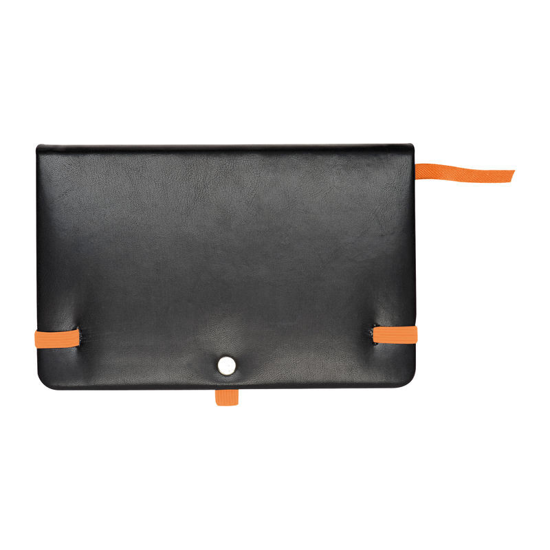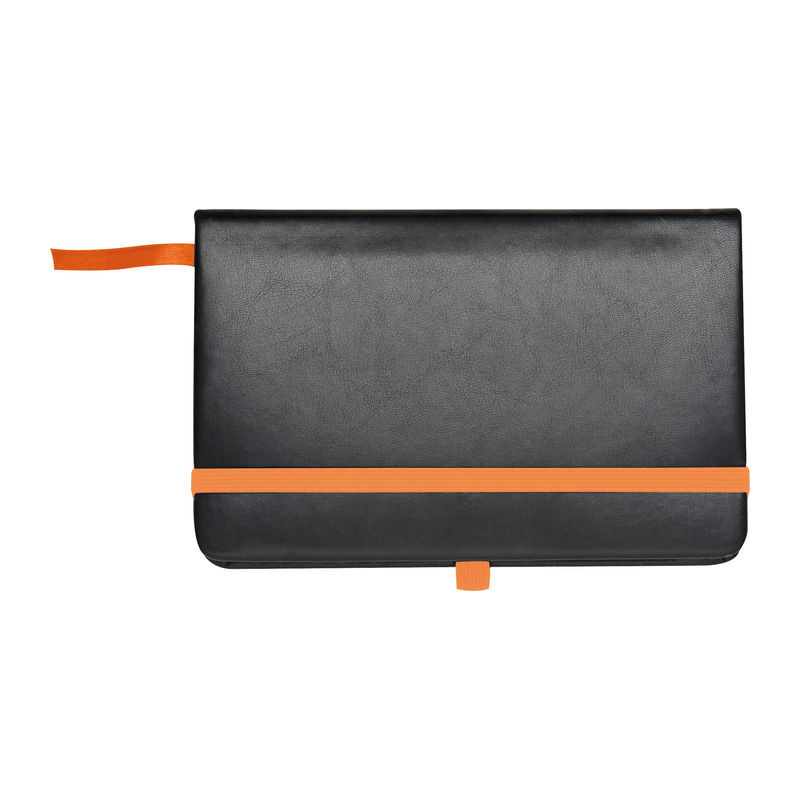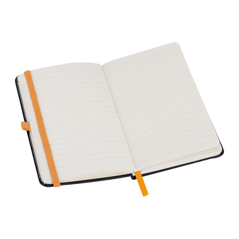 A6 méretű divatos notesz puha műbőr borítással, 160 oldallal, könyvjelzővel, tolltartó hurokkal, valamint gumi zárópánttal.