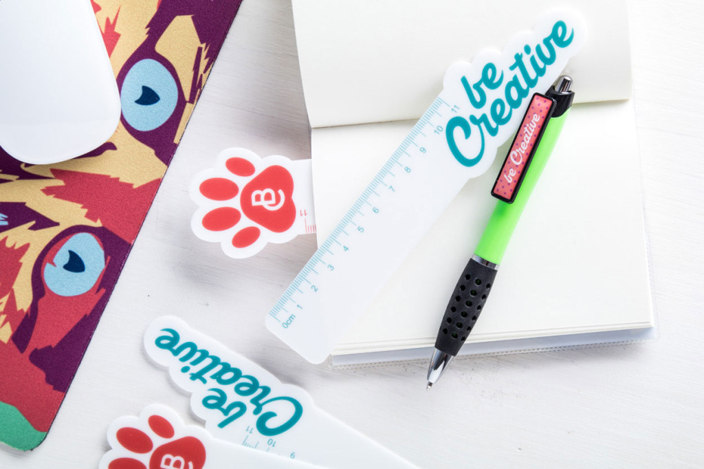 Műanyag, 11 cm-es, egyedi gyártású vonalzó, a végén egyediesíthető formával, melynek maximális mérete: 50×50 mm. Az ár tartalmazza 1 szín emblémázási költségét. Minimális rendelési mennyiség: 100 db.