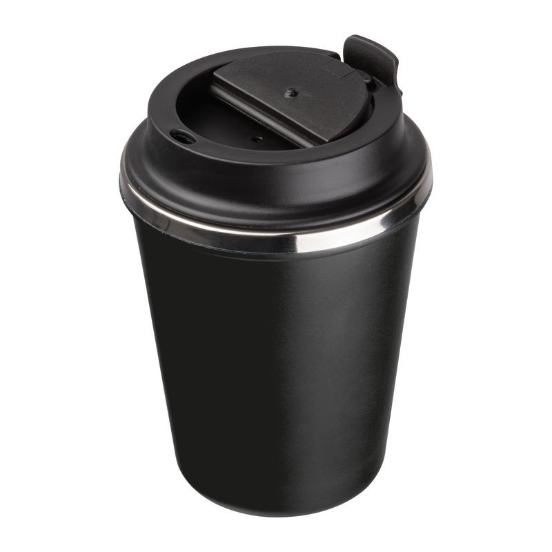 Elegáns, duplafalú vákuumos termosz pohár rozsdamentes acél belsővel és újrahasznosított műanyag külsővel. 350 ml-es űrtartalommal és szivárgásmentes csavaros kupakkal.