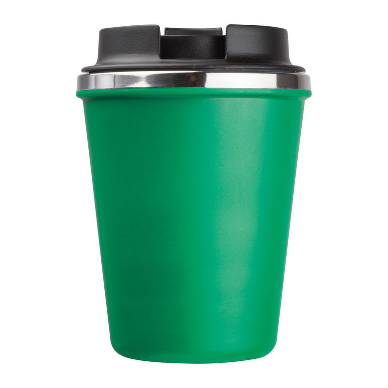 Elegáns, duplafalú vákuumos termosz pohár rozsdamentes acél belsővel és újrahasznosított műanyag külsővel. 350 ml-es űrtartalommal és szivárgásmentes csavaros kupakkal.