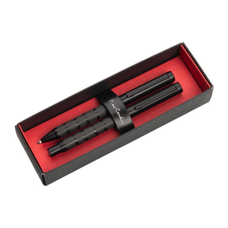 Elegáns Pierre Cardin fém írószerkészlet. A tollak teste fekete, egyedi struktúrájú dizájnnal. A roller hegye sapkával védett, amely a toll színével egyezik, a golyóstoll forgómechanizmussal rendelkezik. A roller Német Schmidt kék betéttel rendelkezik 0,6 mm-es heggyel, a golyóstoll kiváló minőségű kék betéttel rendelkezik 1 mm-es heggyel. Mindkettő tartalék fekete betétet is tartalmaz, díszdobozban, eredetiségi tanúsítvánnyal együtt.