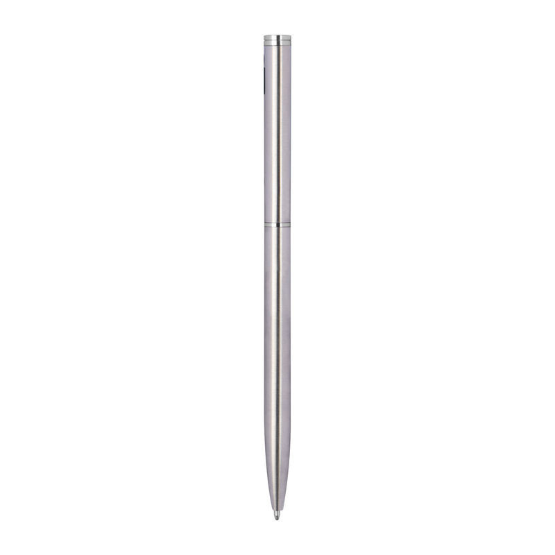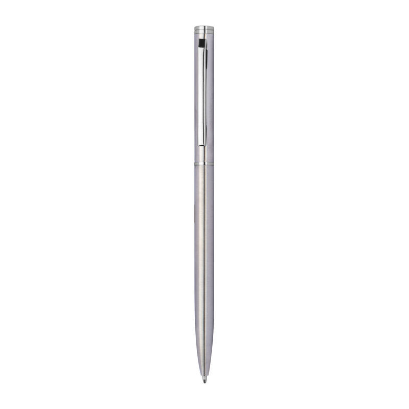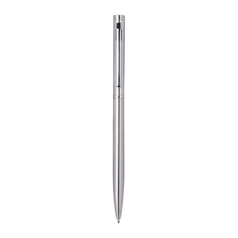 Elegáns, vékonytestű, csavaró mechanikás fém golyóstoll kék betéttel.