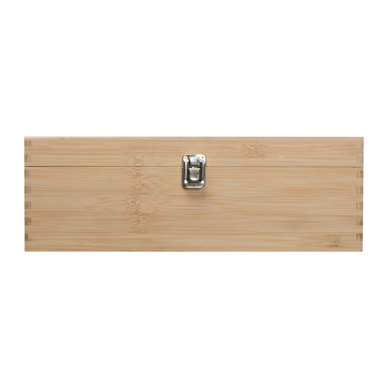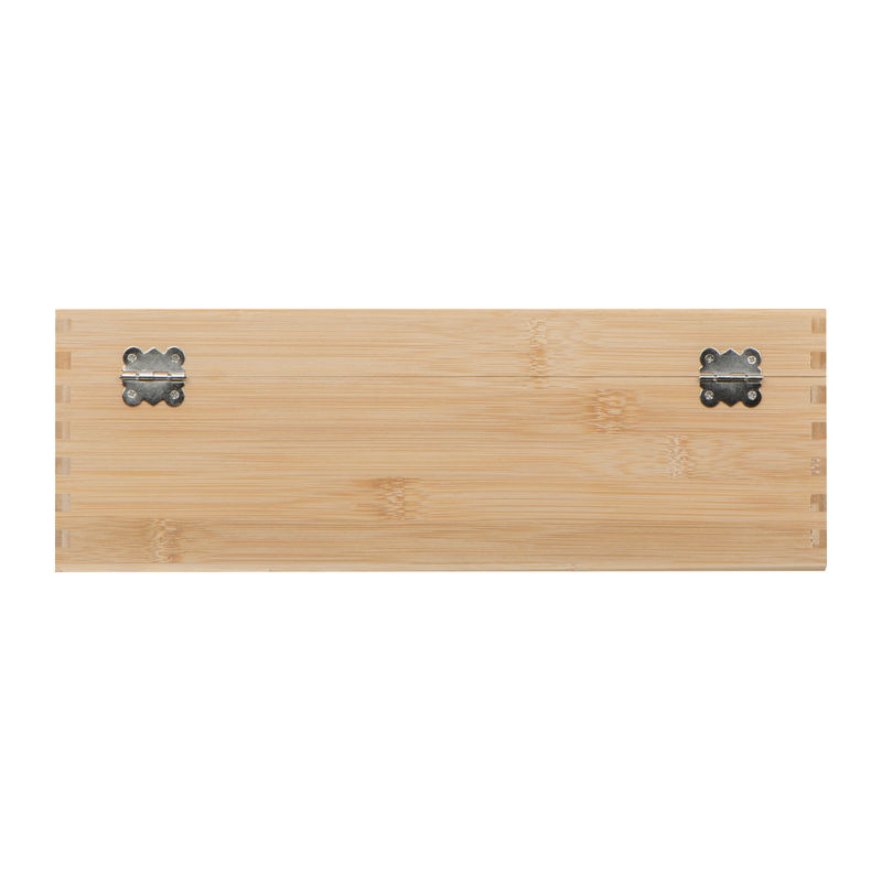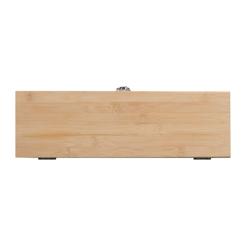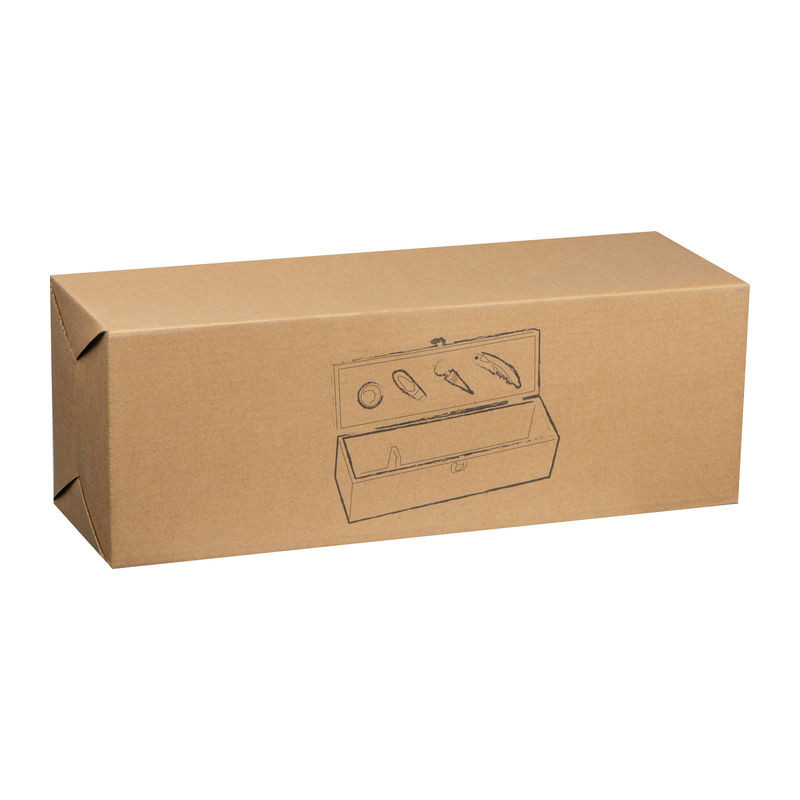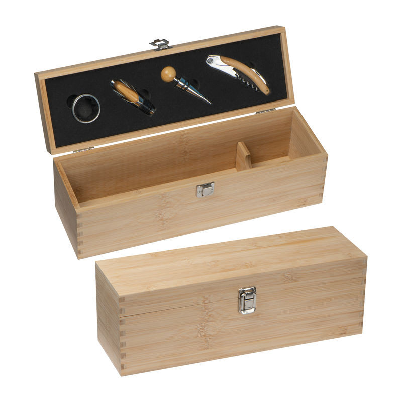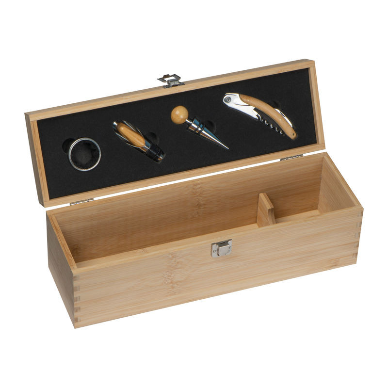 Világos fából készült boros szett, beépített pincérkéssel, palackdugóval, kiöntővel és csepegtetőgyűrűvel a fedélben. A kiegészítő fa betét biztonságosan rögzíti a palackot a dobozban.