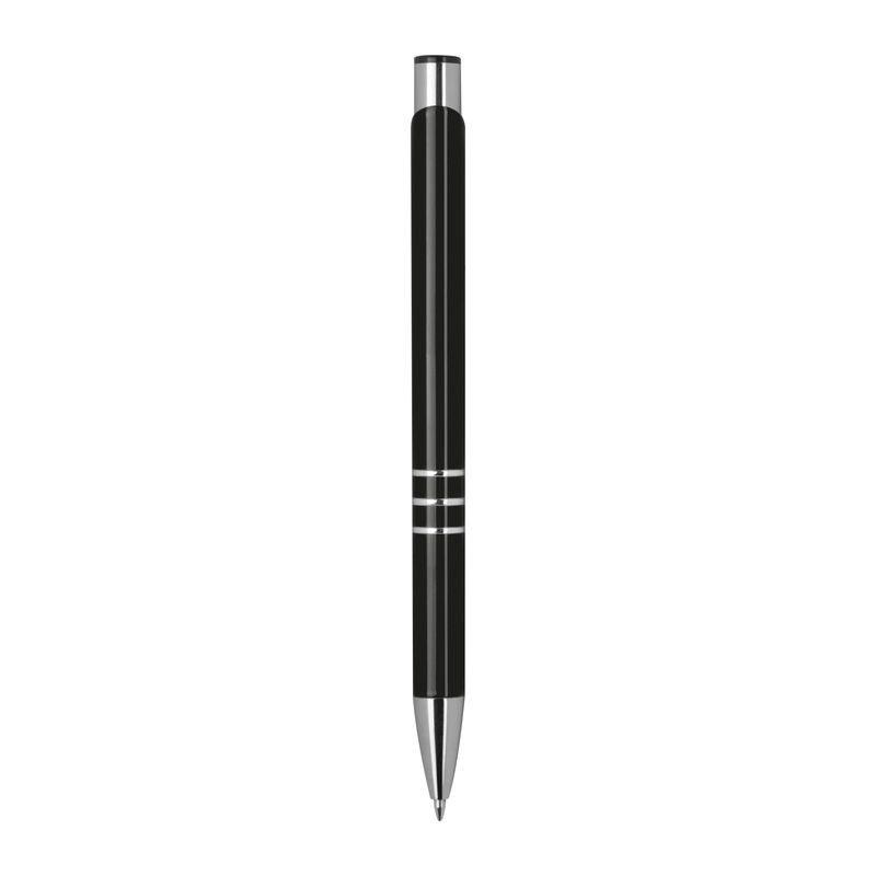 Lakkozott felületű, három díszítő gyűrűvel ellátott, kéken író fém golyóstoll.