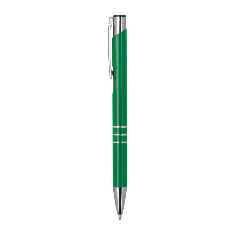 Lakkozott felületű, három díszítő gyűrűvel ellátott, kéken író fém golyóstoll.