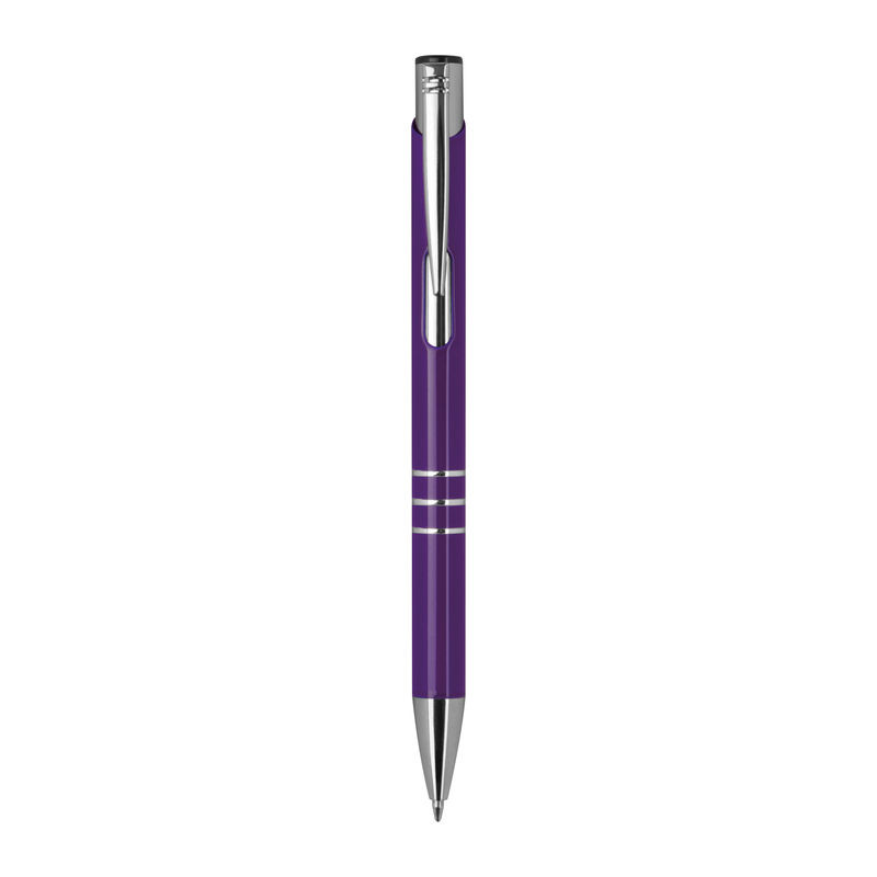 Lakkozott felületű, három díszítő gyűrűvel ellátott, kéken író fém golyóstoll.
