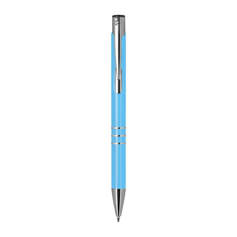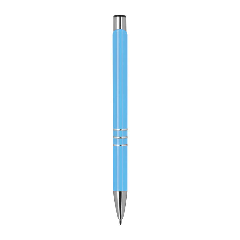 Lakkozott felületű, három díszítő gyűrűvel ellátott, kéken író fém golyóstoll.