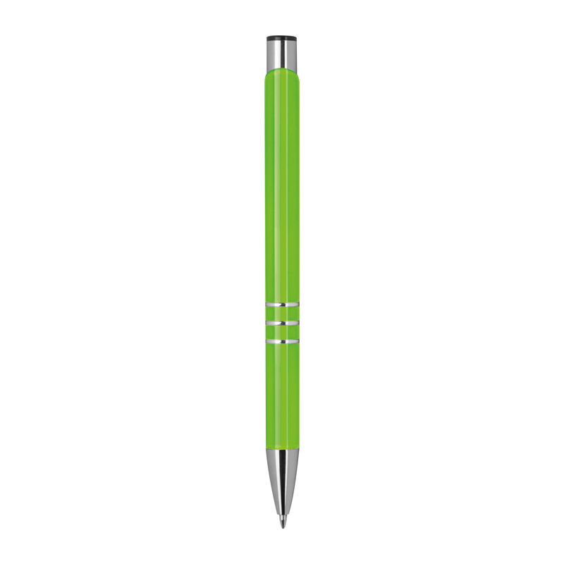 Lakkozott felületű, három díszítő gyűrűvel ellátott, kéken író fém golyóstoll.