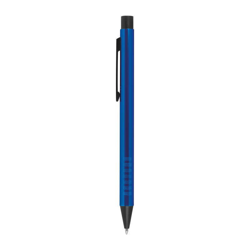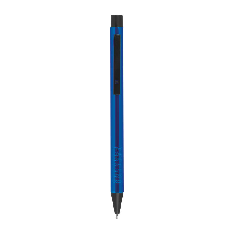 Extravagáns markolatú fém golyóstoll, kék betéttel, fekete kiegészítőkkel.