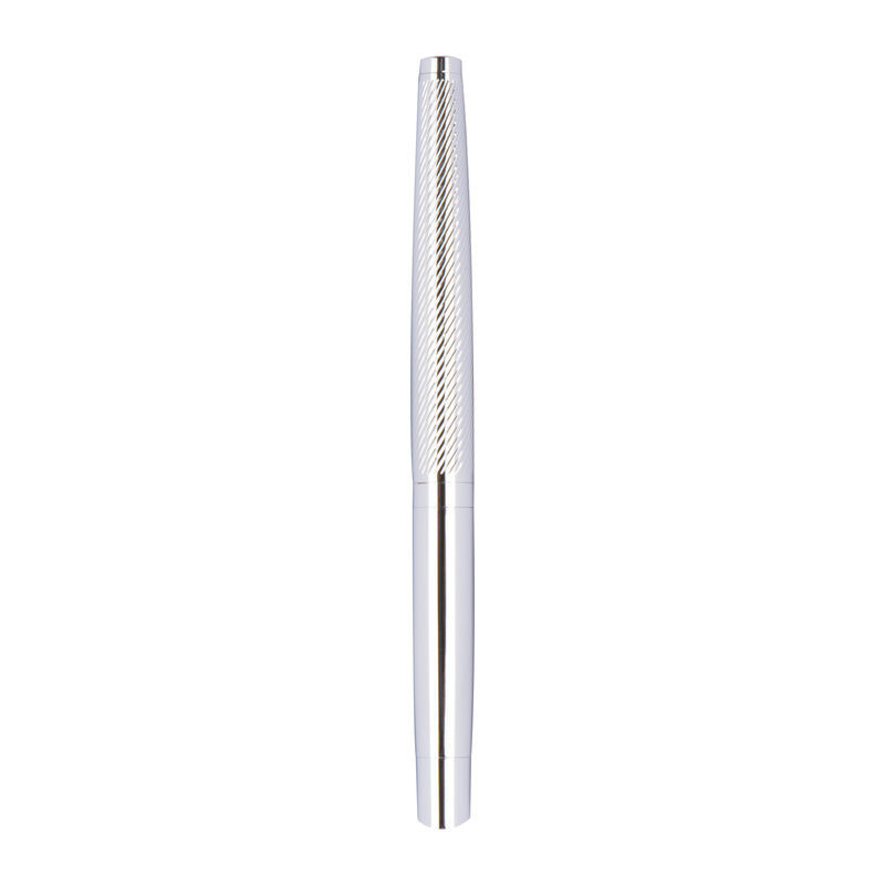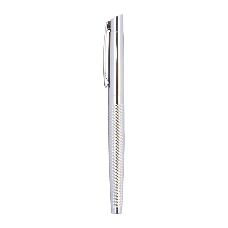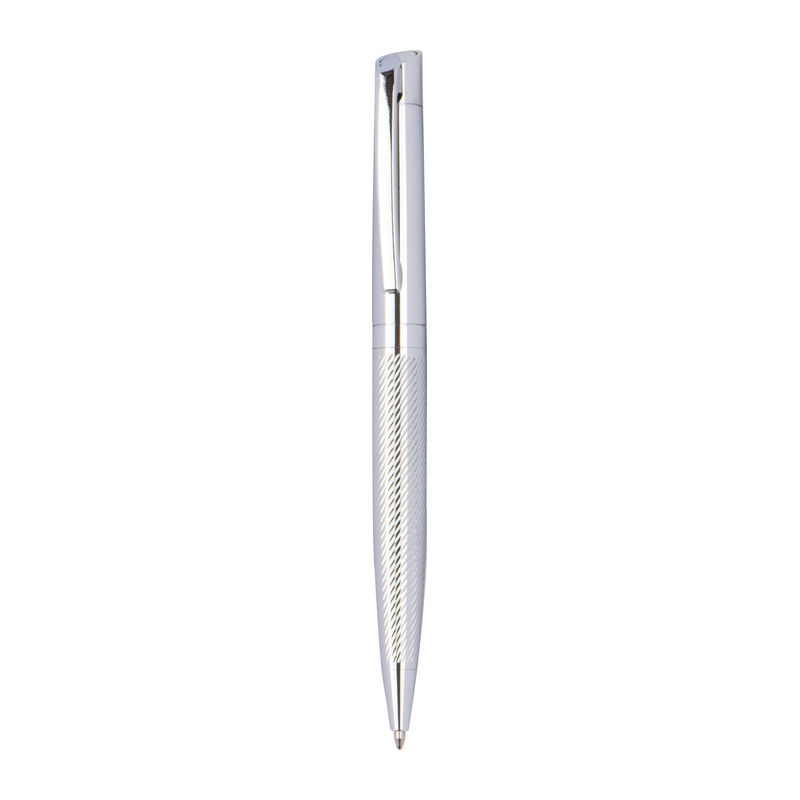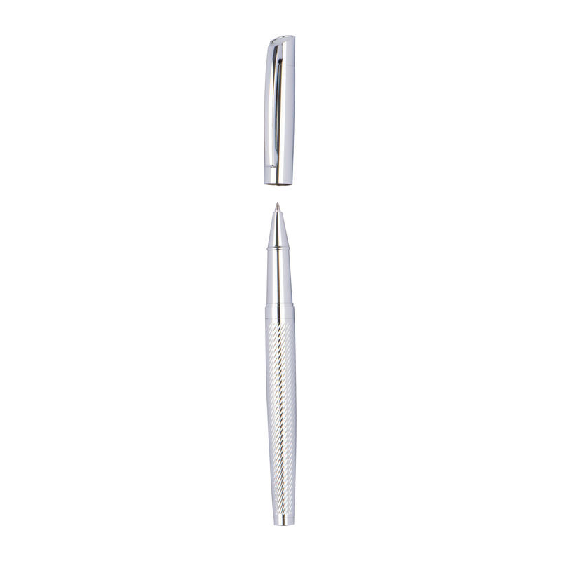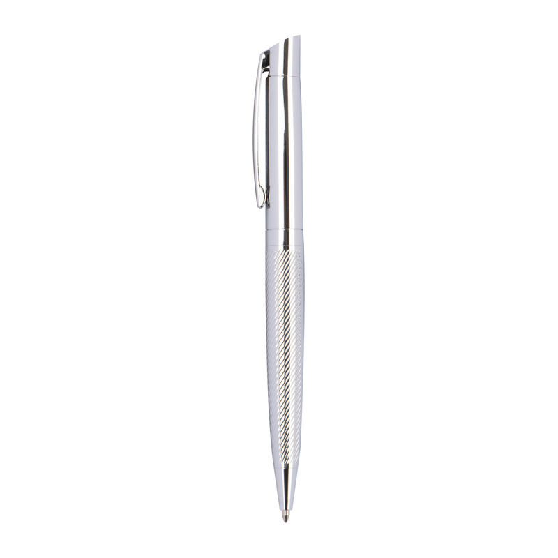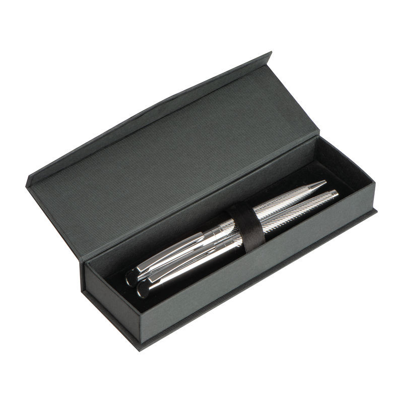 Írószer szett, amely egy golyóstollból és egy rollertollból áll, fényes krómozott fémből, fekete ajándékcsomagolásban. Mindkét írószer kék színnel ír.