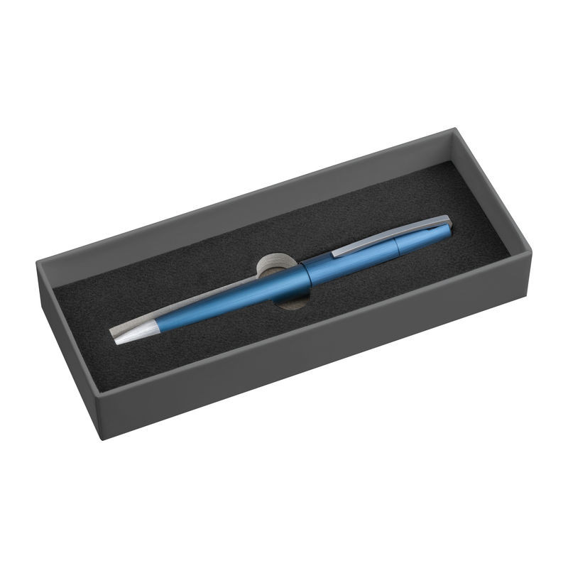 Elegáns csavaró mechanikás, kéken író Ferraghini golyóstoll, fém testtel, ezüst kiegészítőkkel és kék nagy térfogatú tollbetéttel.