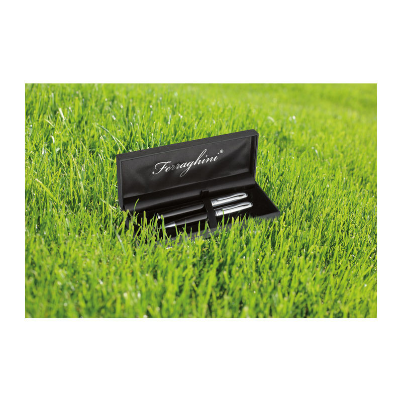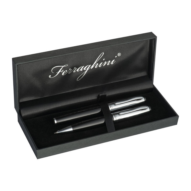 Klasszikusan elegáns Ferraghini toll szett, mely tartalmaz egy csavaró mechanikás golyóstollat és egy rollertollat (mindkettő kék betéttel). Gyönyörű fekete összecsukható dobozban érkezik.